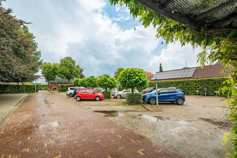 De centrale parkeerplaats van bedrijvencomplex “De Hanenhof”, ontsloten aan de zijde van de Nude voorziet in twee parkeerplaatsen per kantoorunit.