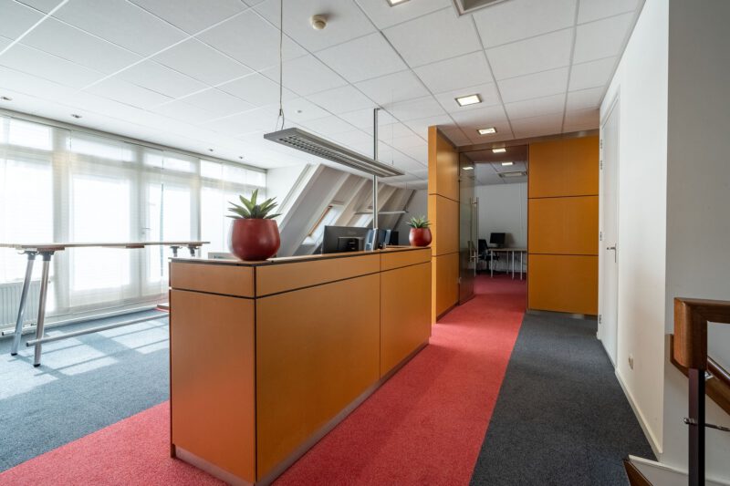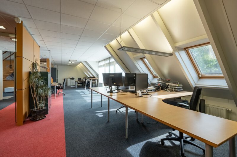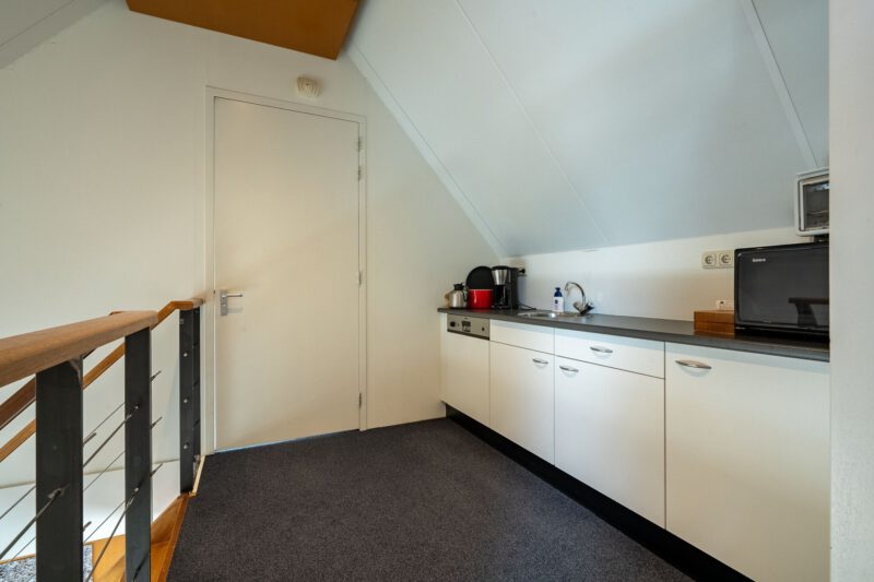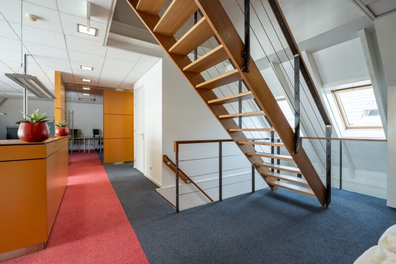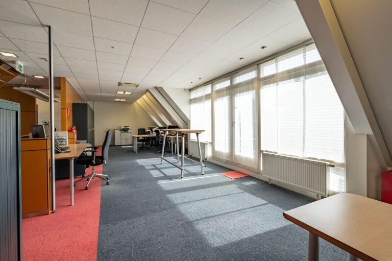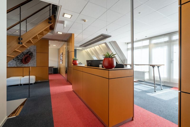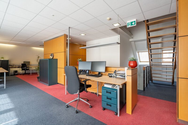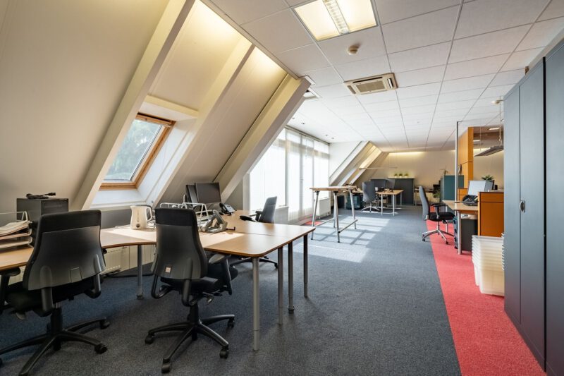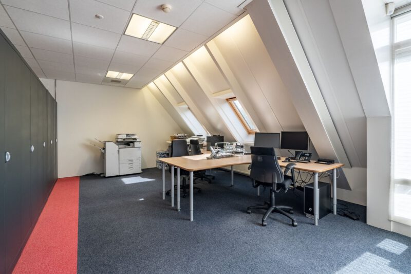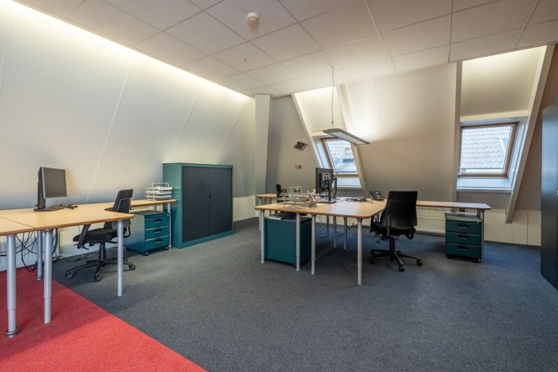 Representatieve zelfstandige kantoorunit bestaande uit een entree op de begane grond, een open kantoorruimte en een afgesloten kantoorruimte op de eerste verdieping met een dubbele toiletgelegenheid, twee balkons en een gebruiksoppervlakte van circa 139 m². Op de tweede verdieping bevindt zich op de ruime overloop een kitchenette voorzien van een recht keukenblok en vaatwasser, een gesloten kantoor-/vergaderruimte en een afgesloten bergruimte met opstelplaats voor de C.V.-installatie. De 2e verdieping heeft een gebruiksoppervlakte van circa 47 m².