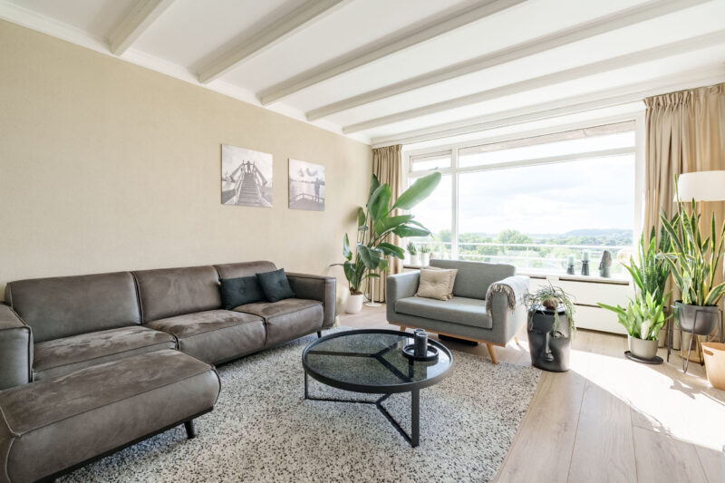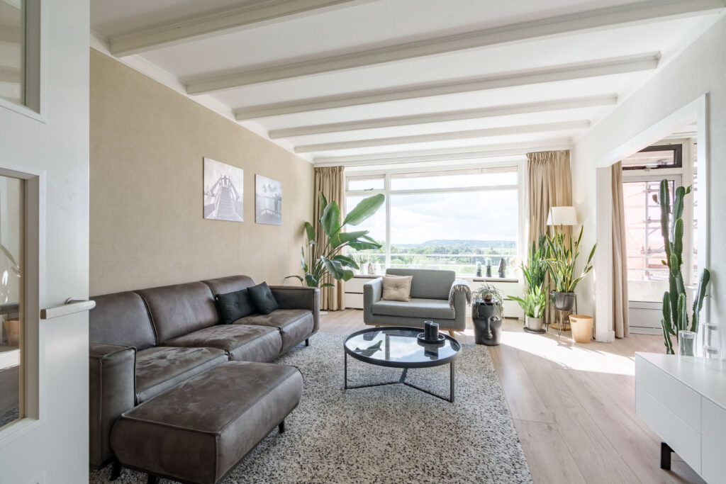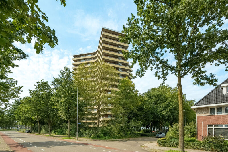 Op de achtste verdieping, met een prachtig panoramisch uitzicht, gelegen royaal VIERKAMERAPPARTEMENT van circa 84 m² met balkon en een eigen berging in de onderbouw. Vanuit het appartement geniet u van een fraai uitzicht over de landerijen, de uiterwaarden en de Rijn.