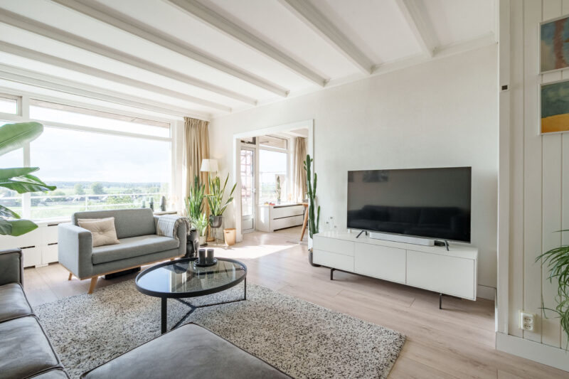 – Balkon met uitzicht over landerijen, uiterwaarden en de Rijn;