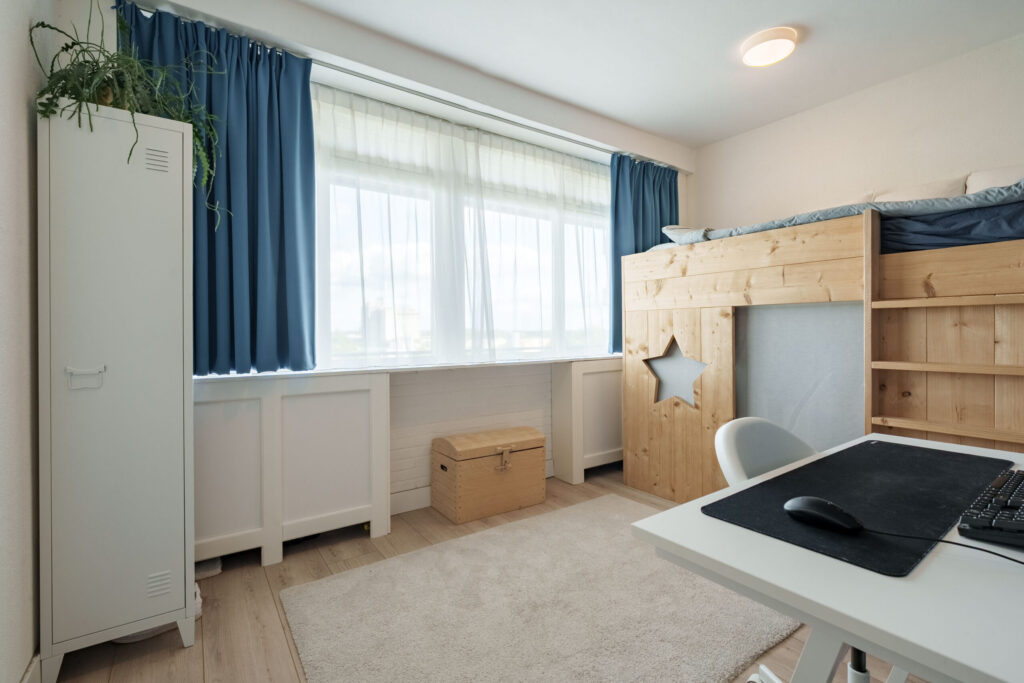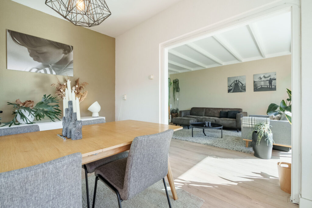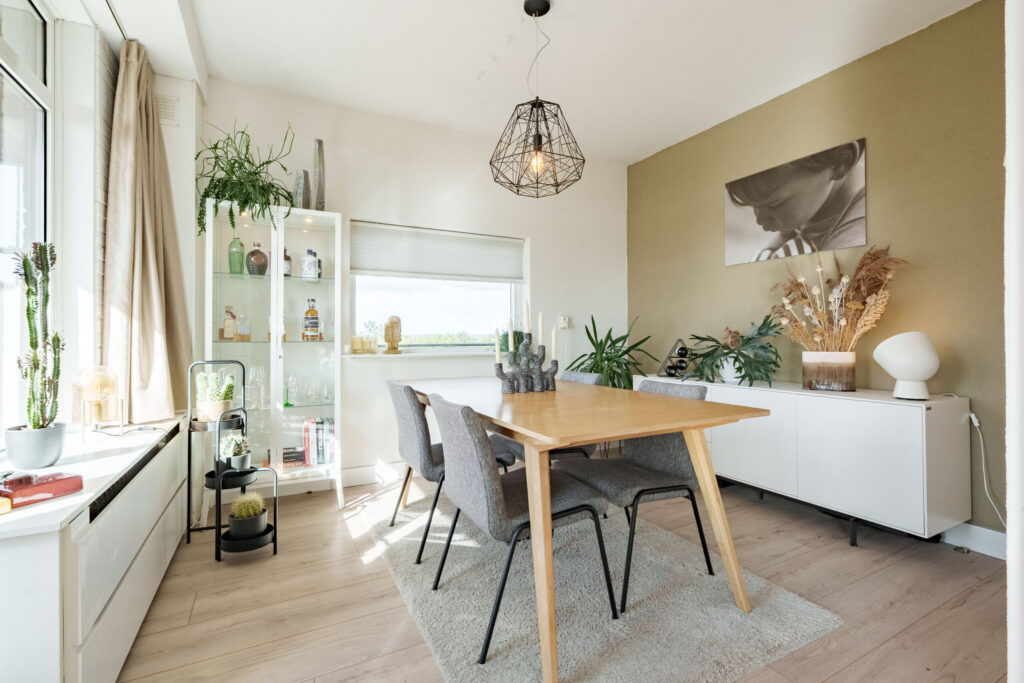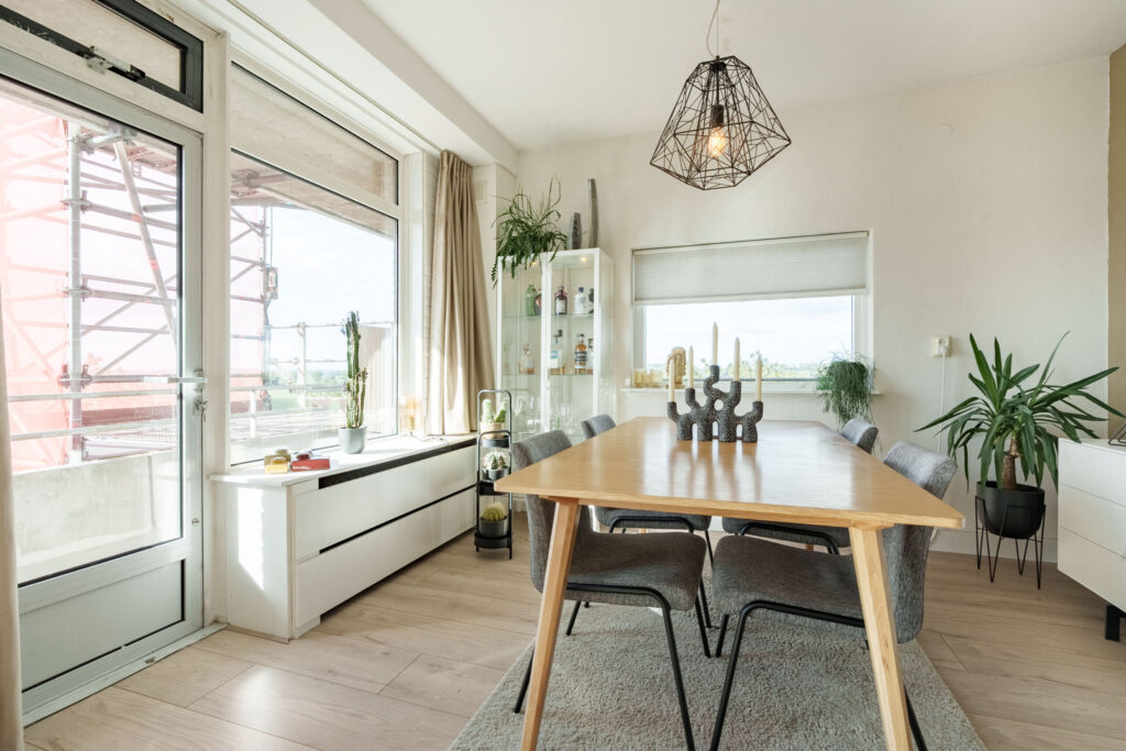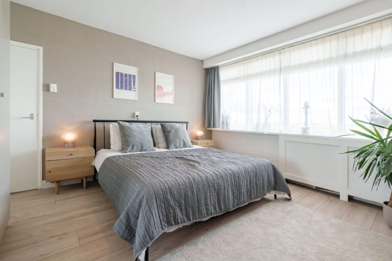Het appartement beschikt over een lichte woonkamer met aangrenzende eetkamer, twee slaapkamers en een praktische indeling die zorgt voor een comfortabel woongevoel. Dankzij de grote raampartijen is er sprake van een prettige lichtinval, wat het appartement een open en ruimtelijke uitstraling geeft.
