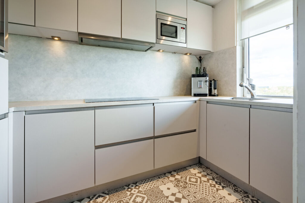 De moderne keuken is voorzien van diverse inbouwapparatuur, te weten: een inductiekookplaat, afzuigkap, combi-oven/combimagnetron, koel-/vriescombinatie en een vaatwasser.