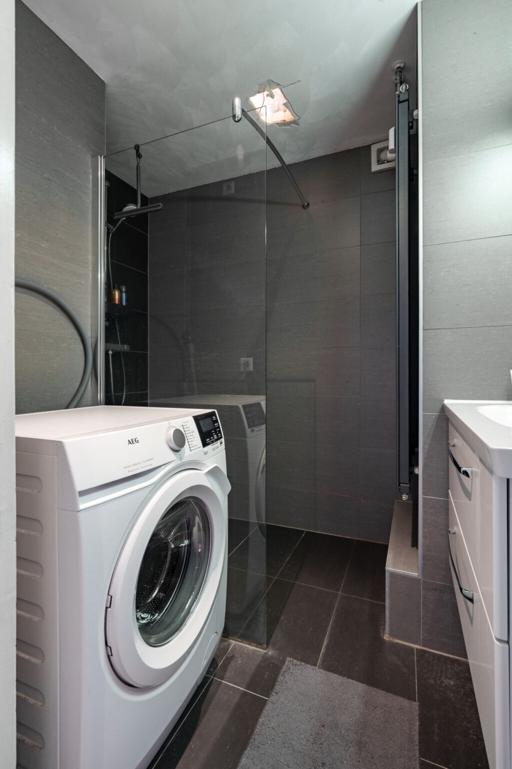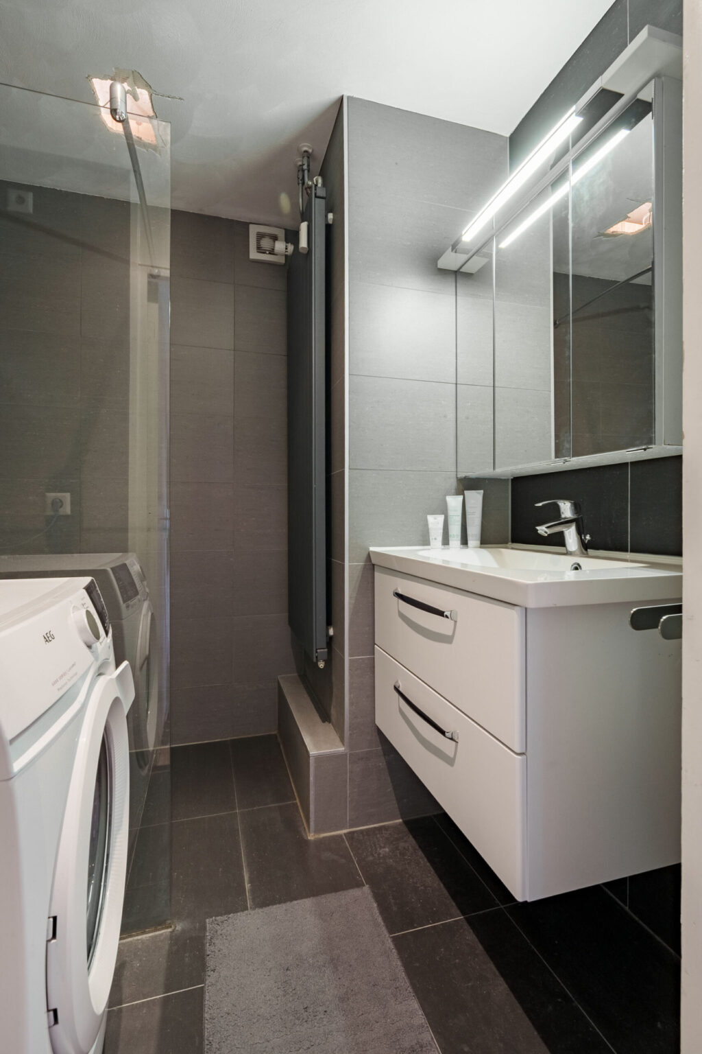 De betegelde badkamer is ingericht met een inloopdouche, een wastafel met wastafelmeubel en een aansluiting voor de wasmachine.