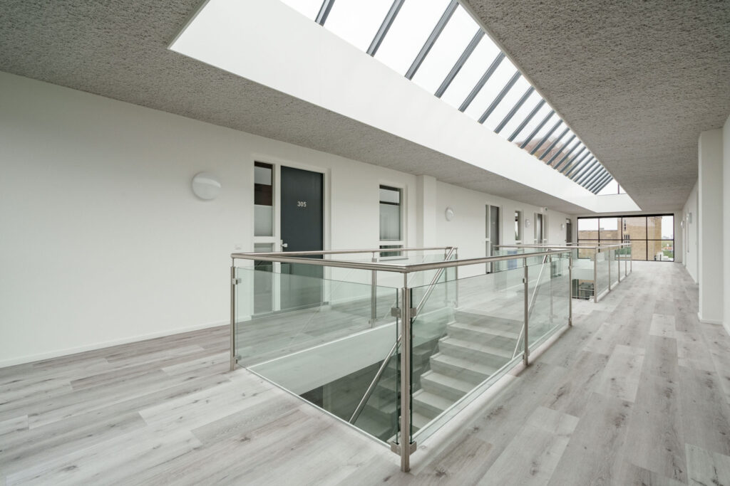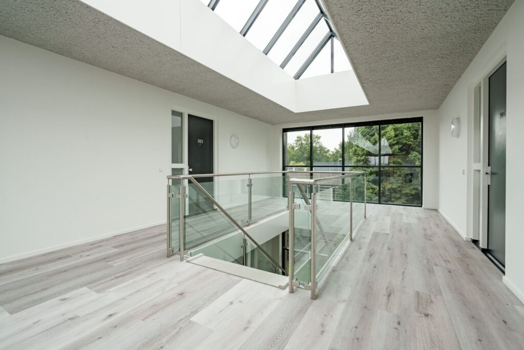 De toegang tot de appartementen bevindt zich in de vide, wat een intiem en sfeervolle beleving biedt.