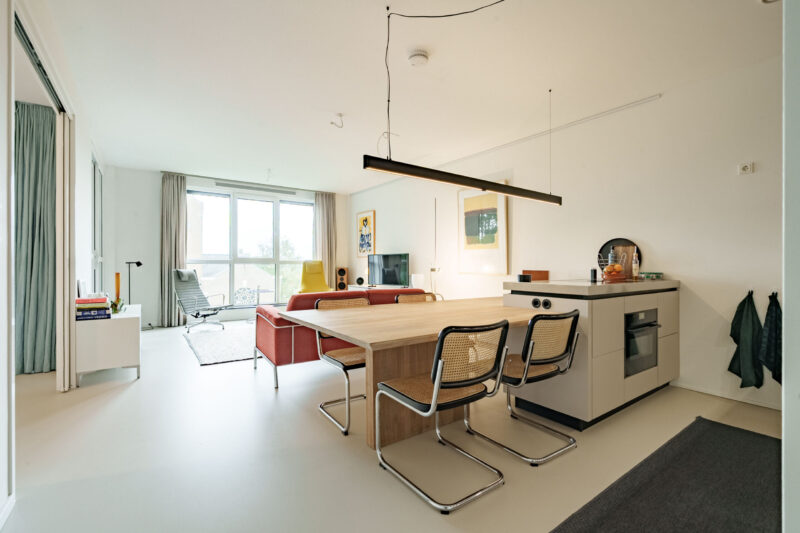 Entree, hal, lichte woonkamer met mooie grote raampartijen en toegang tot het balkon, open keuken voorzien van een moderne keukenopstelling met een schier-kookeiland en een geïntegreerde houten eettafel.