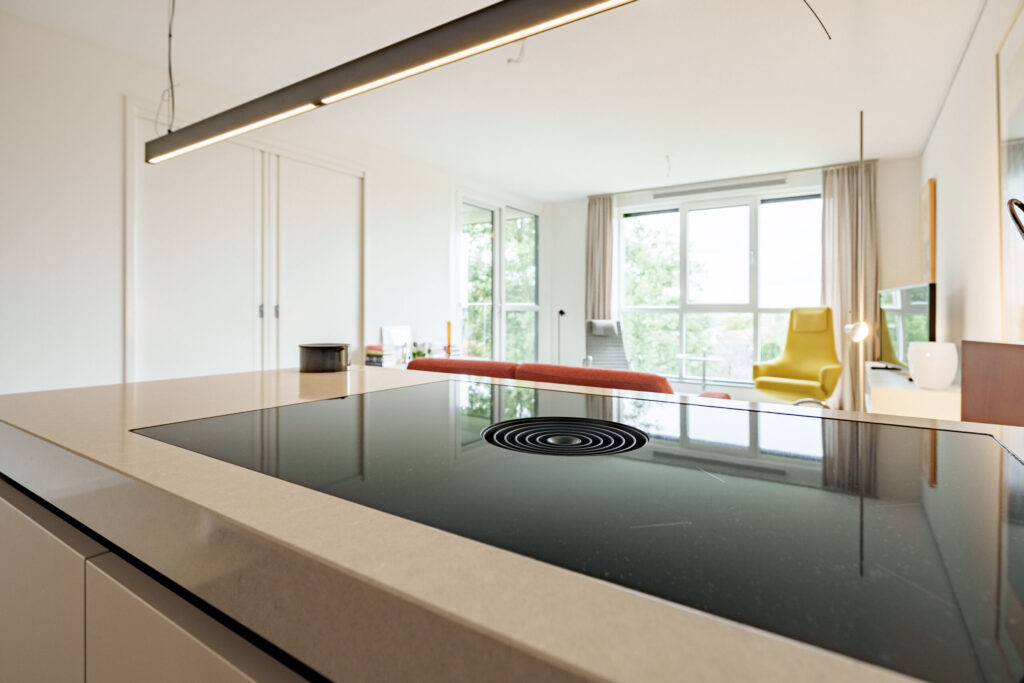 Inbouwapparatuur: inductiekookplaat met geïntegreerde afzuiging, oven, koelkast, vaatwasser en een quooker.