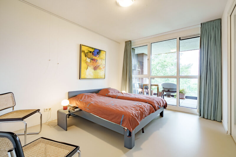 De slaapkamer heeft zicht op het balkon en een mooie kastenwand.