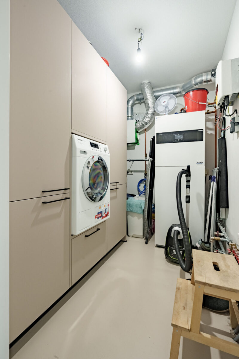 Vanuit de hal is de tweede slaapkamer te bereiken. Toilet met fontein, inpandige berging/technische ruimte met een mooie grote kastombouw voor de wasmachine en bevat ook nog eens een koelkast en een vriezer. Verder bevindt zich in de berging de warmtepomp en het ventilatiesysteem en is er ruimte voor extra berging.