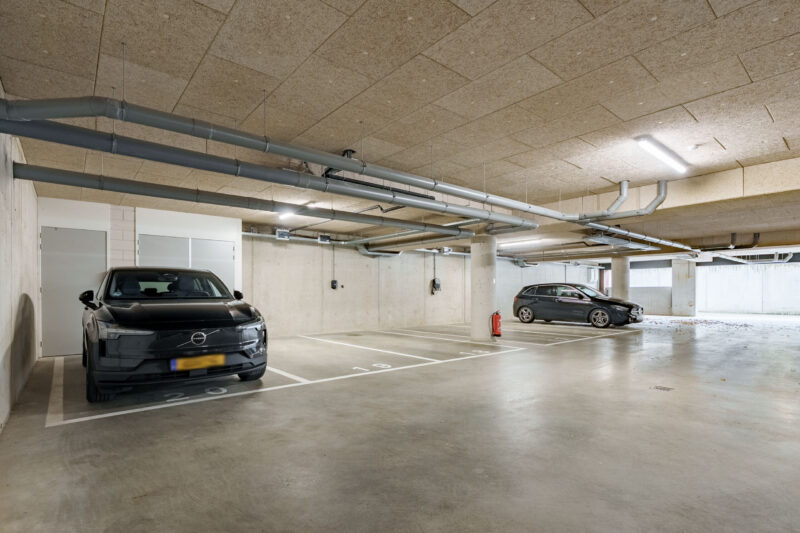 Onder het complex zit een ruim opgezette parkeergarage met voor ieder appartement een eigen parkeerplaats met een eigen laadpunt voor de elektrische auto en een eigen berging.