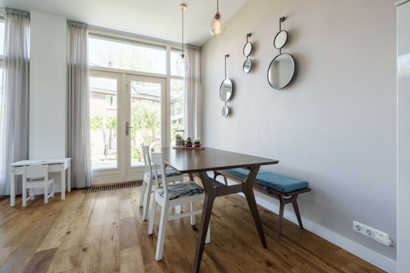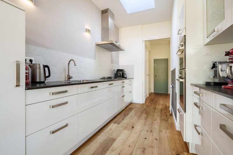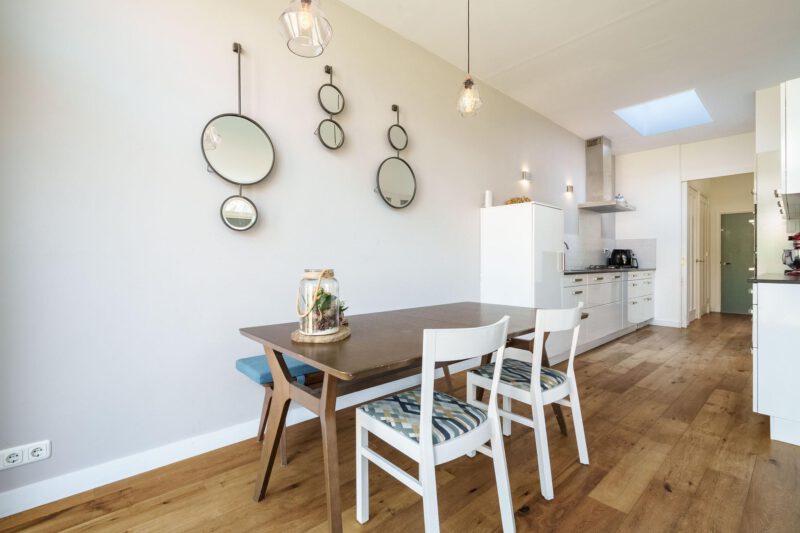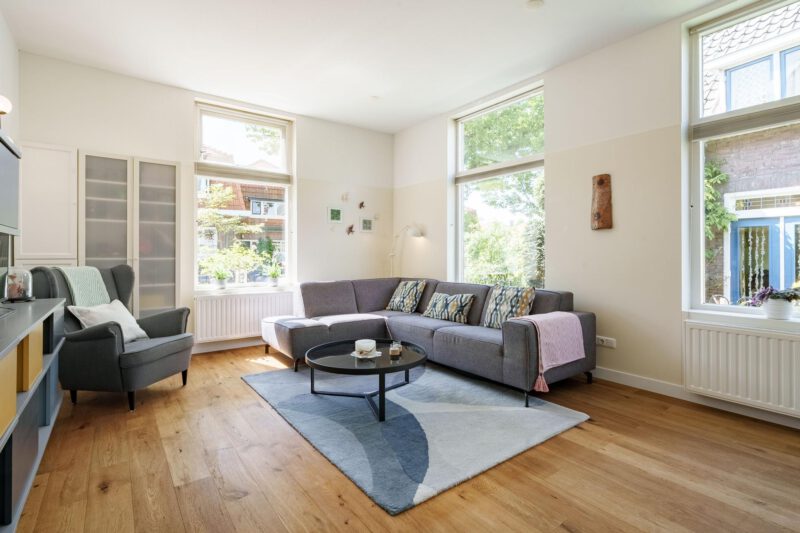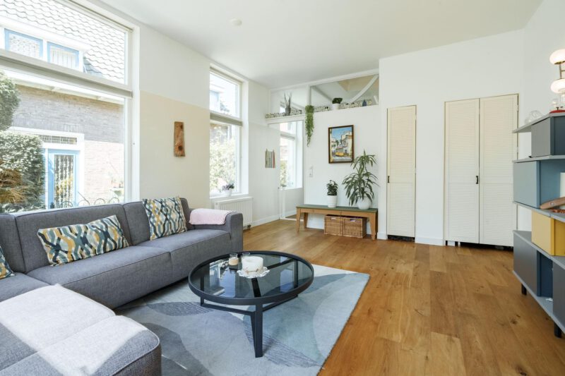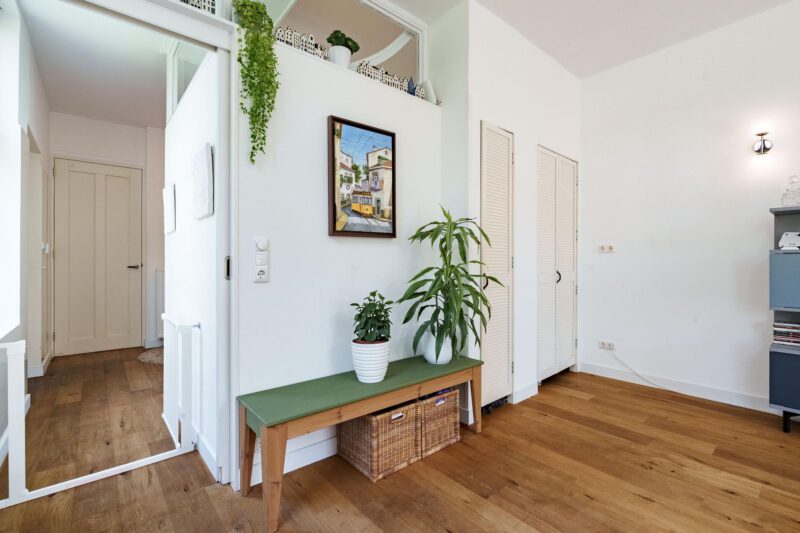 Bij binnenkomst via de centrale hal valt direct de praktische indeling op. Hier heeft u toegang tot een nette, moderne toiletruimte met een vloer met terazzo tegels, wanden in microcement en toilet met ingebouwde geurzuivering systeem en in de hal bevindt zich een vaste kast. De hal vormt de centrale spil van waaruit u toegang heeft tot alle vertrekken op deze verdieping. Aan de voorzijde van de woning bevindt zich een ruime woonkamer. De woonkamer is voorzien van een vaste kast en de meterkast. De grote raampartijen zorgen voor veel daglichtinval en maken deze ruimte bijzonder aangenaam om te verblijven.