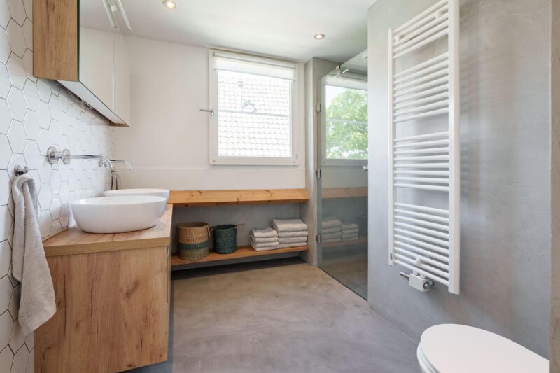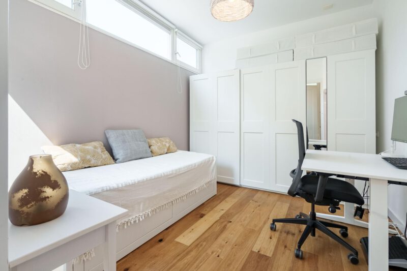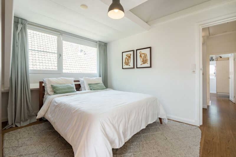 Op de eerste verdieping bevinden zich twee ruime, lichte slaapkamers, beide met een erg prettige lichtinval door de grote ramen. Centraal gelegen op deze verdieping bevindt zich de moderne badkamer met een vloer en wanden in microcement. De badkamer is voorzien van een dubbel wastafelmeubel, zwevend toilet en inloopdouche.
