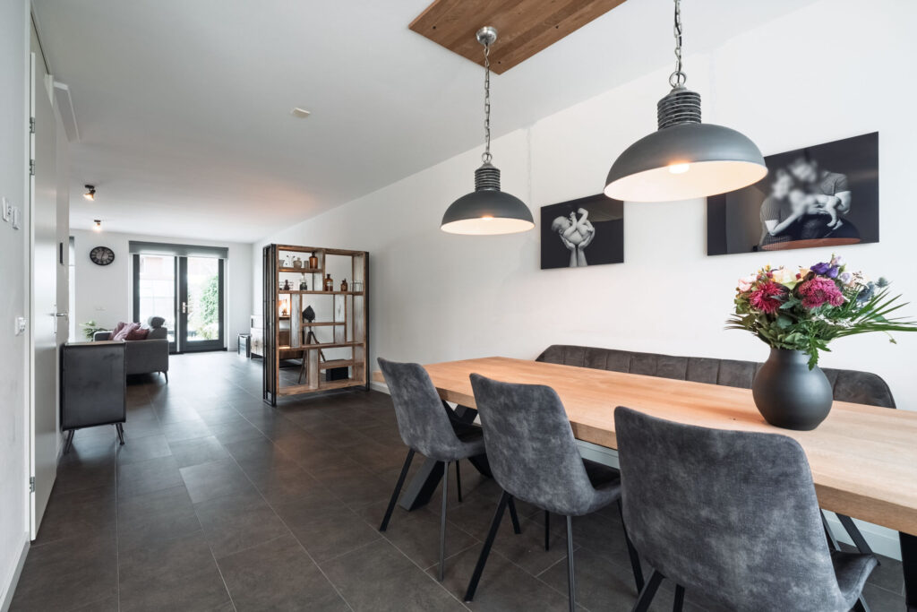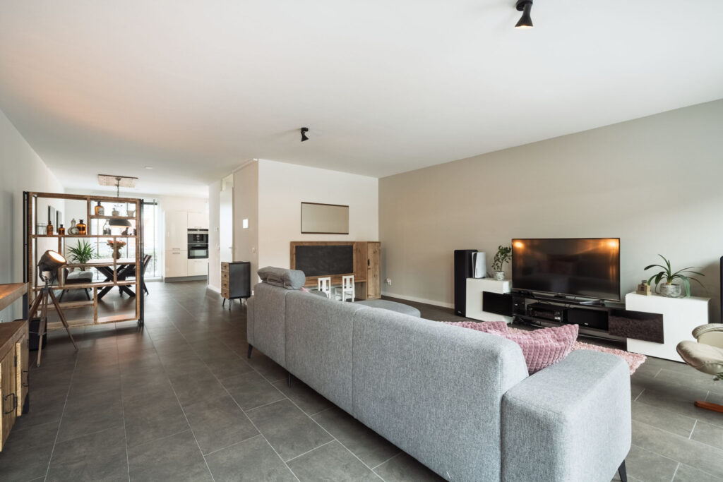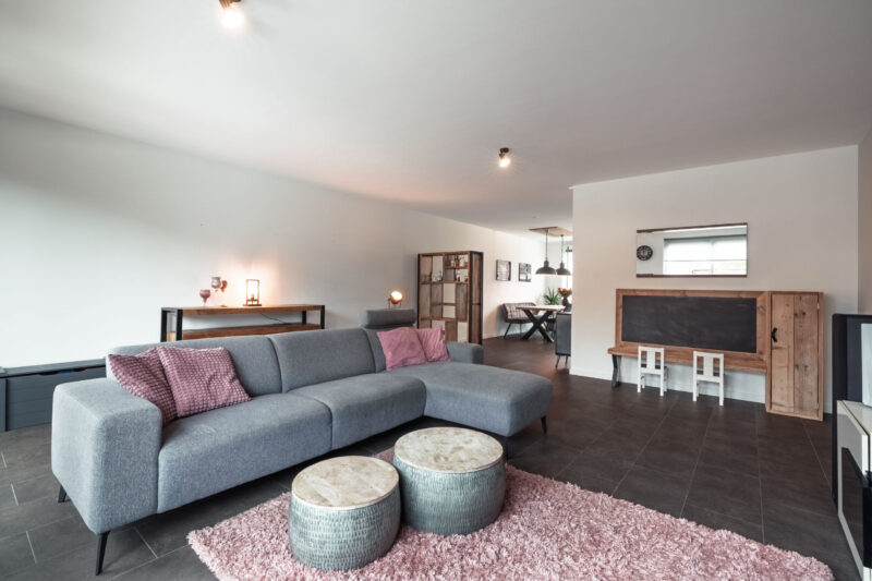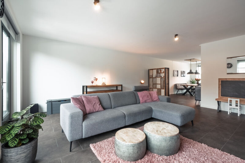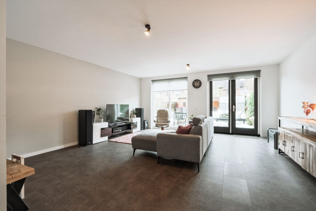 De PVC vloer loopt door in de woonkamer, waardoor de begane grond een mooi en samenhangend geheel vormt. De ruime en lichte woonkamer beschikt over openslaande deuren naar de tuin, wat zorgt voor een prettige verbinding tussen binnen en buiten.