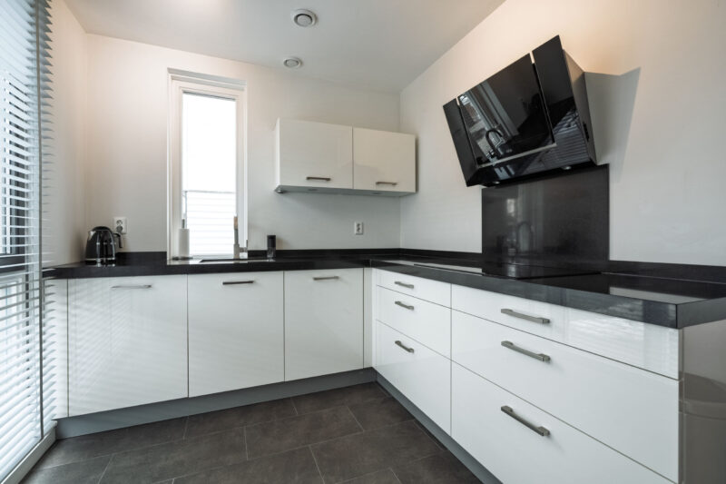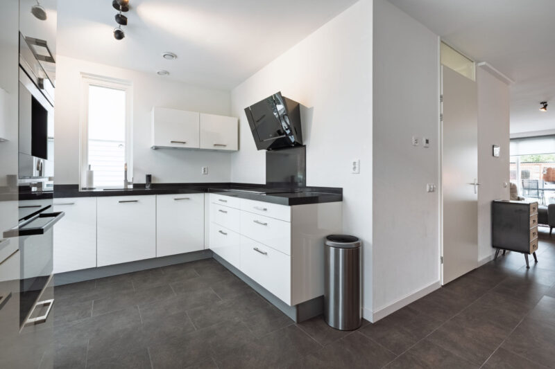 Aan de voorzijde van de woning bevindt zich de moderne keuken, uitgevoerd in een hoogglans witte opstelling. De keuken is voorzien van diverse inbouwapparatuur, waaronder een inductiekookplaat en afzuigkap. De combi-oven en het Siemens koffiezetapparaat zijn fraai verwerkt in een wandkast.