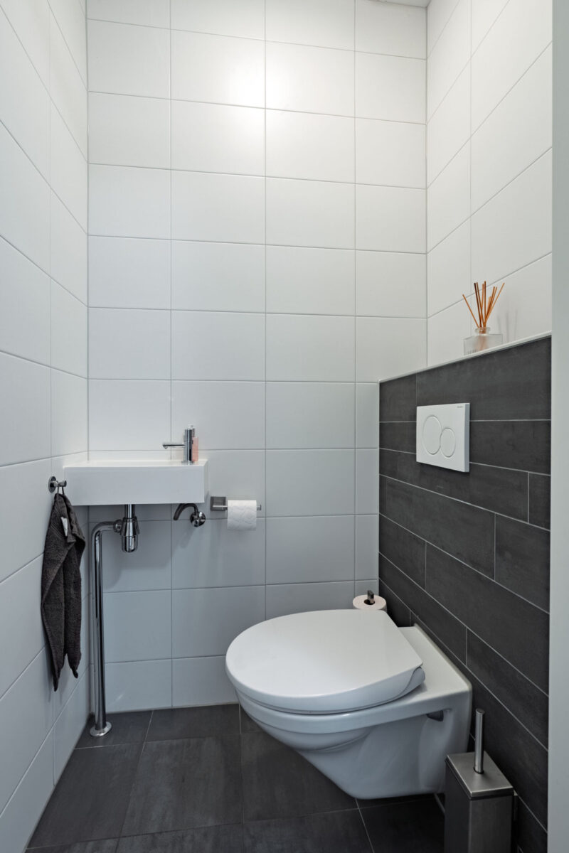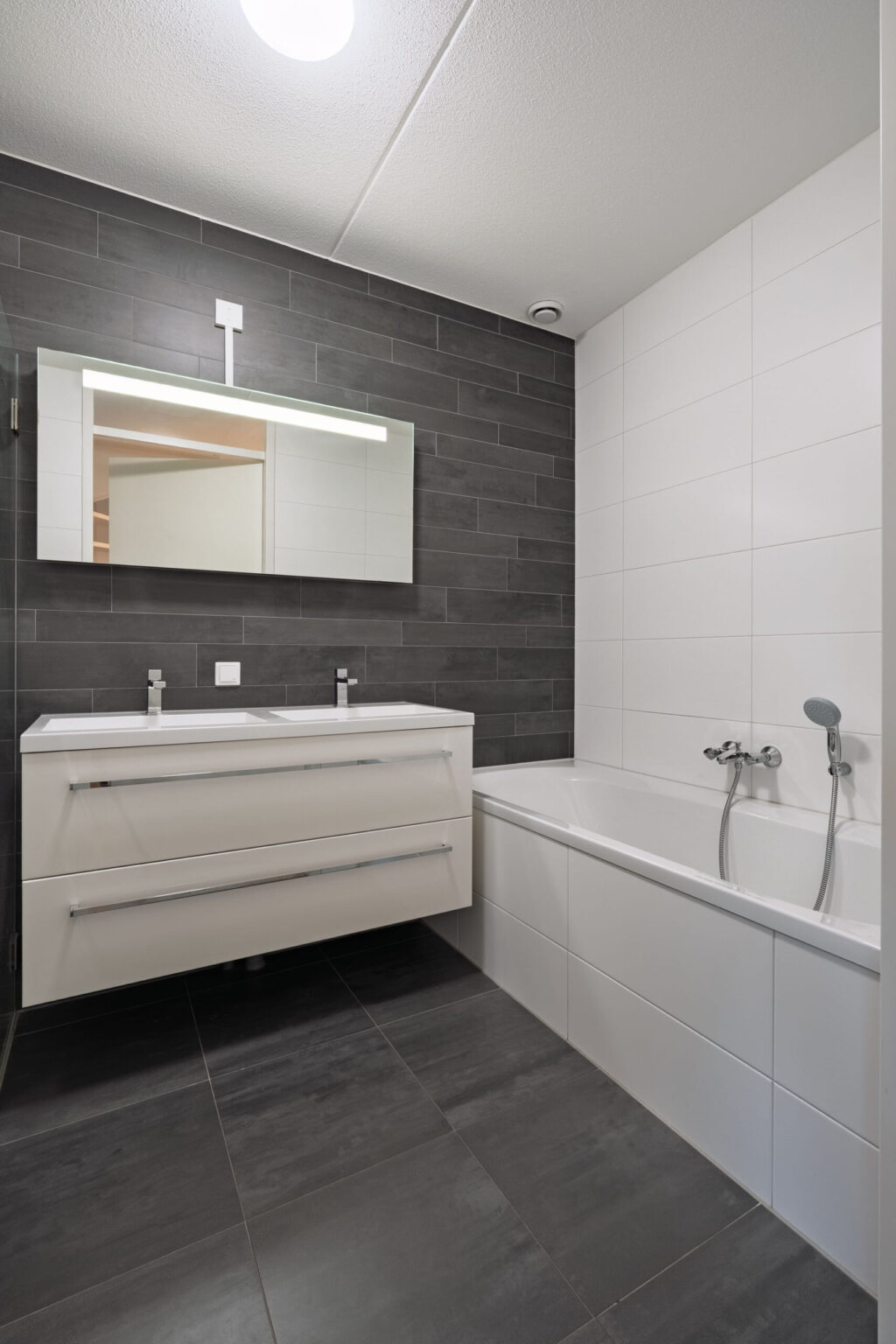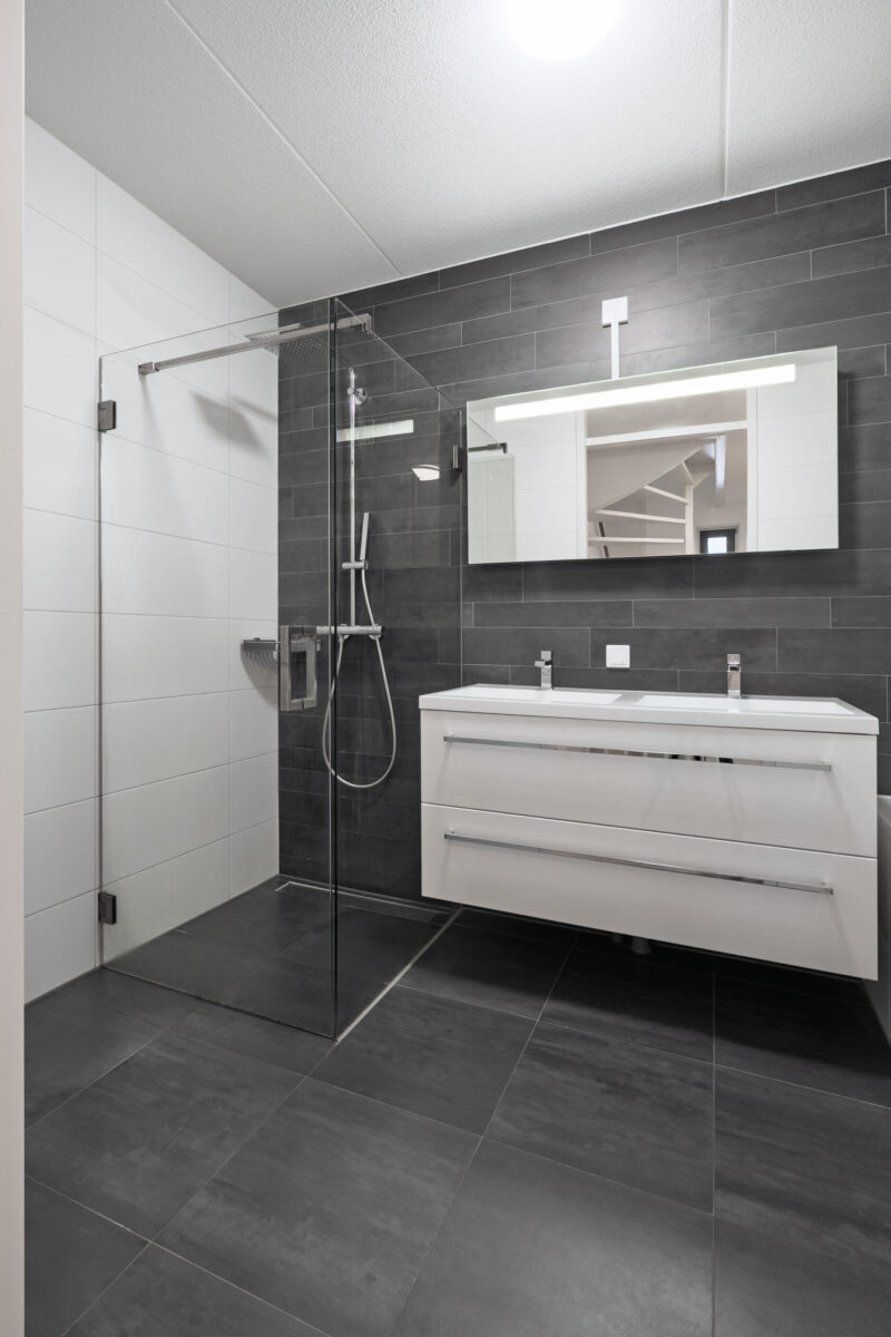 De betegelde badkamer is ingericht met een inloopdouche, een dubbele wastafel met wastafelmeubel en een ligbad. Het toilet is separaat en bevindt zich in een aparte toiletruimte.