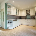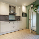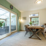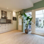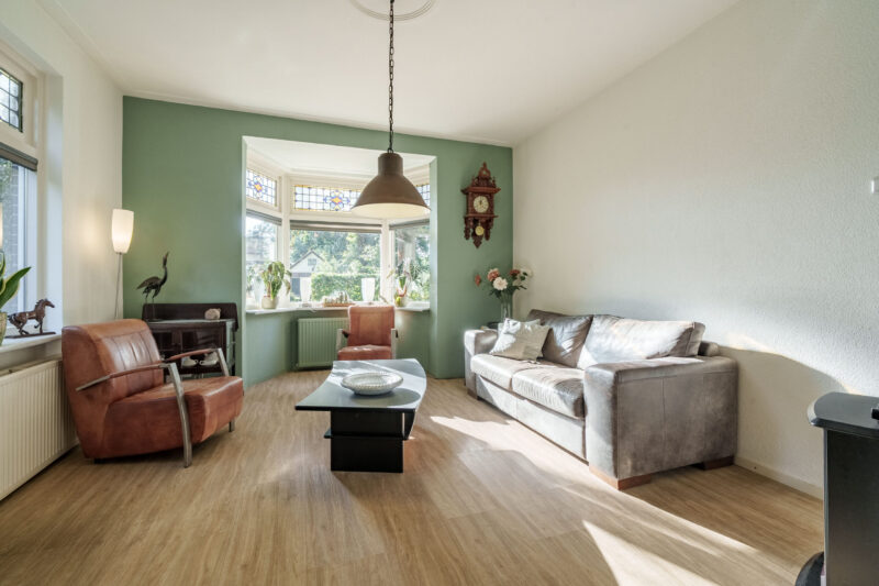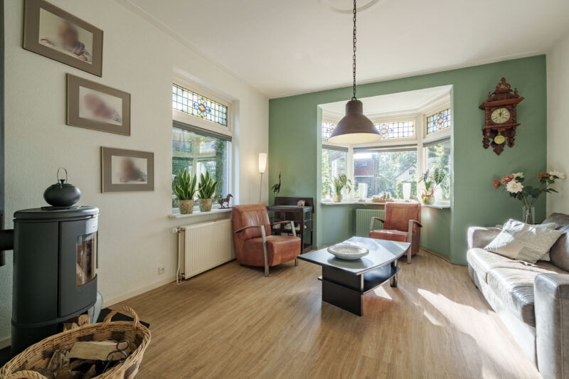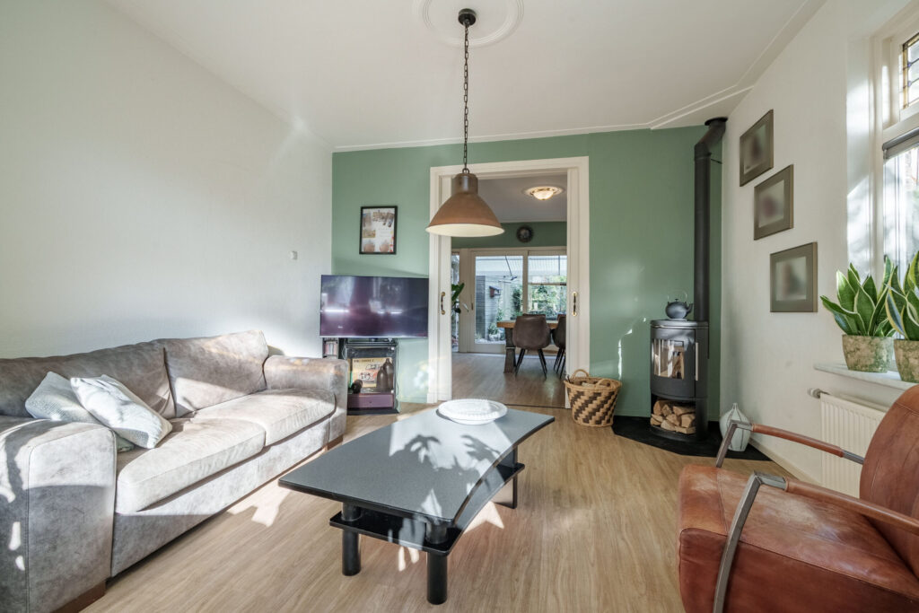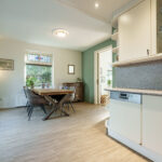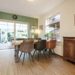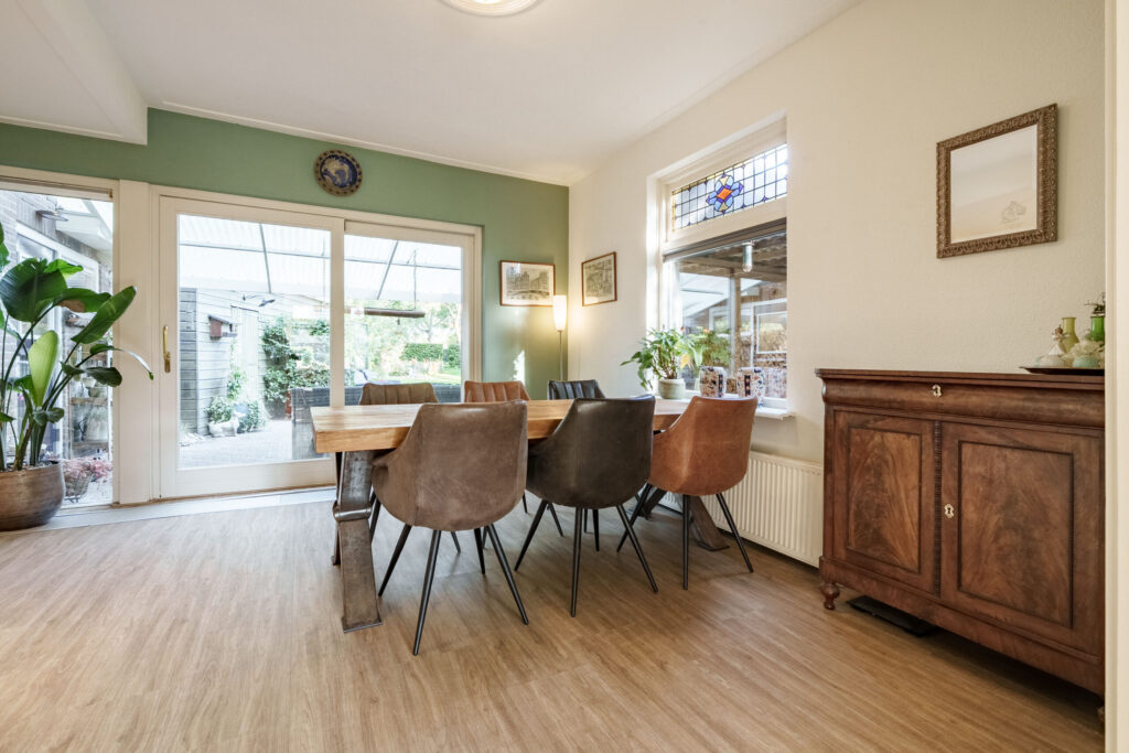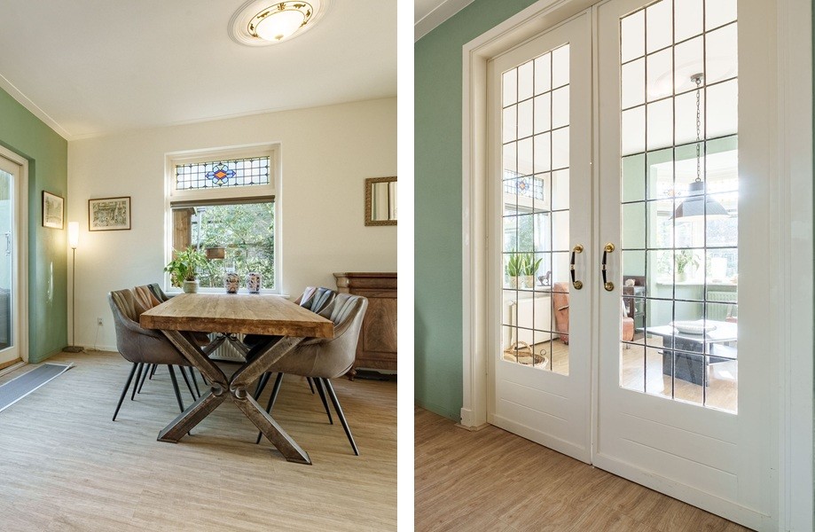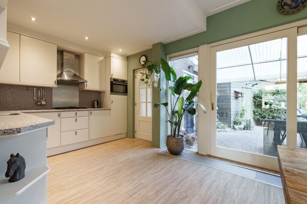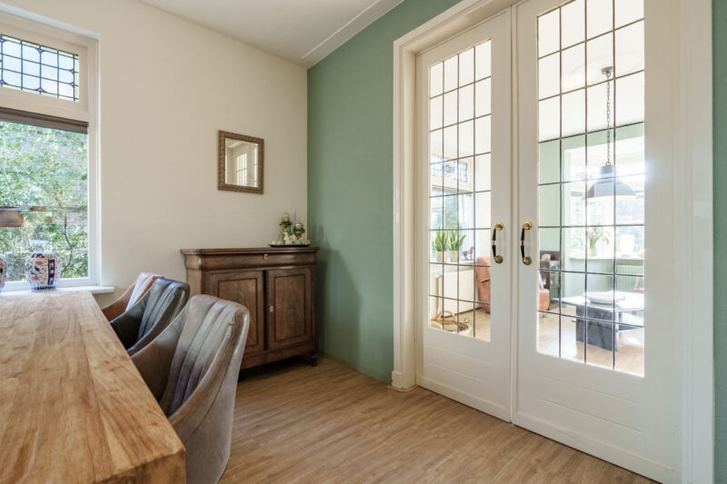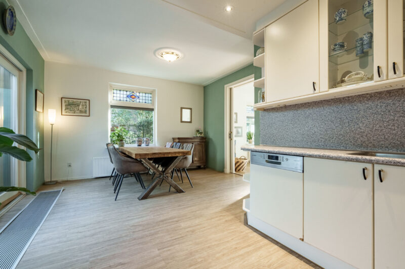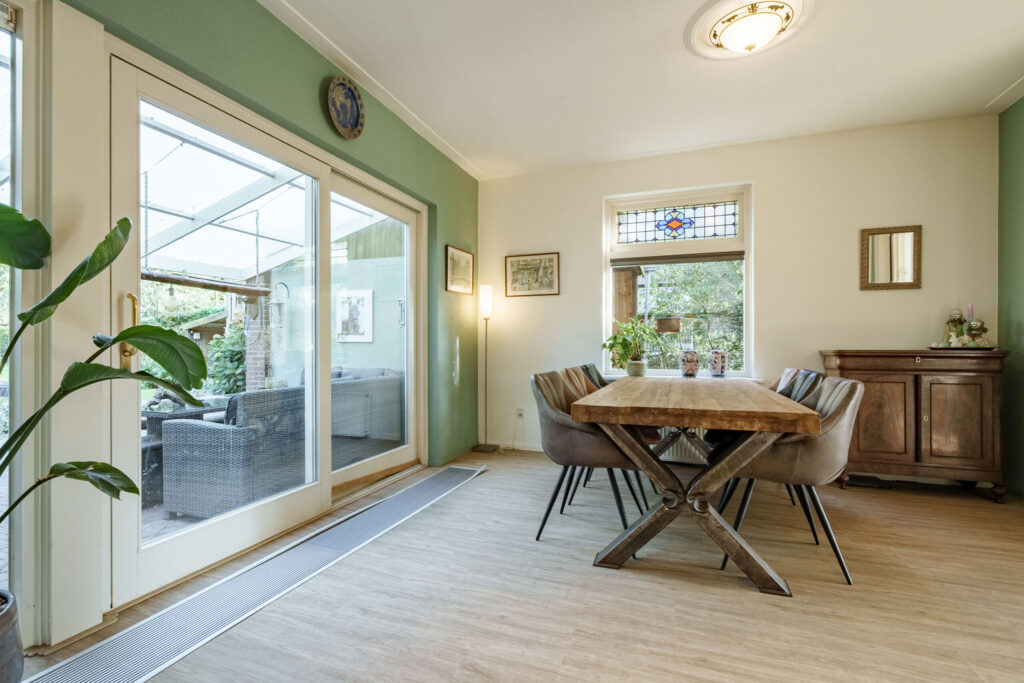 De achterkamer is ingericht als royale woonkeuken. De grote schuifpui geeft niet alleen toegang tot de achtertuin met overkapping maar zorgt ook nog eens voor veel lichtinval. Ook is er een sfeervolle glas-in-lood raam aanwezig.