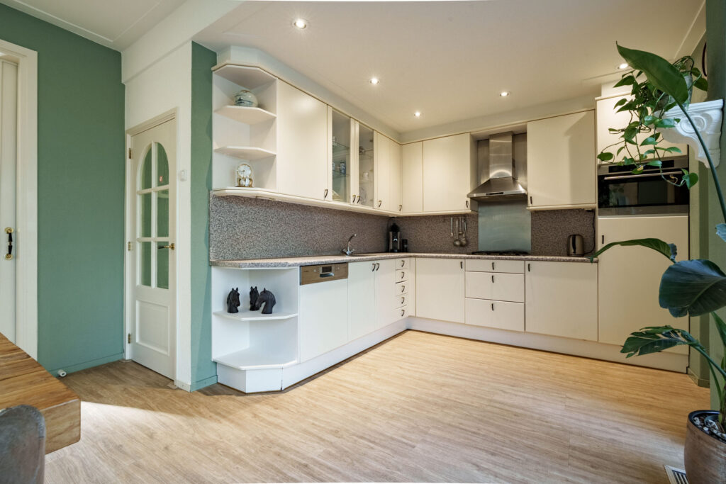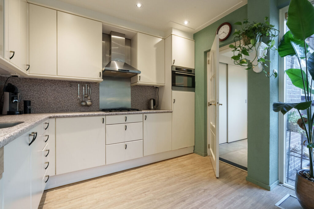 De keukenopstelling is L-vormig en voorzien van inbouwapparatuur, te weten: een 4 pits gaskookplaat, combi-oven, vaatwasser, koelkast en een RVS afzuigkap. Vanuit de keuken toegang tot de bijkeuken voorzien van vloerverwarming, schuifdeurkast, een separate bergkast met aansluiting voor wasapparatuur en een modern toilet met fontein. Via de bijkeuken is ook de achtertuin te bereiken.