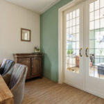 Vanuit de hal toegang tot de sfeervolle kamer-en-suite met glas-in-lood schuifdeuren. Aan de voorzijde is de woonkamer gelegen die voorzien is van een gezellige erker en de kamer heeft diverse glas-in-lood ramen.