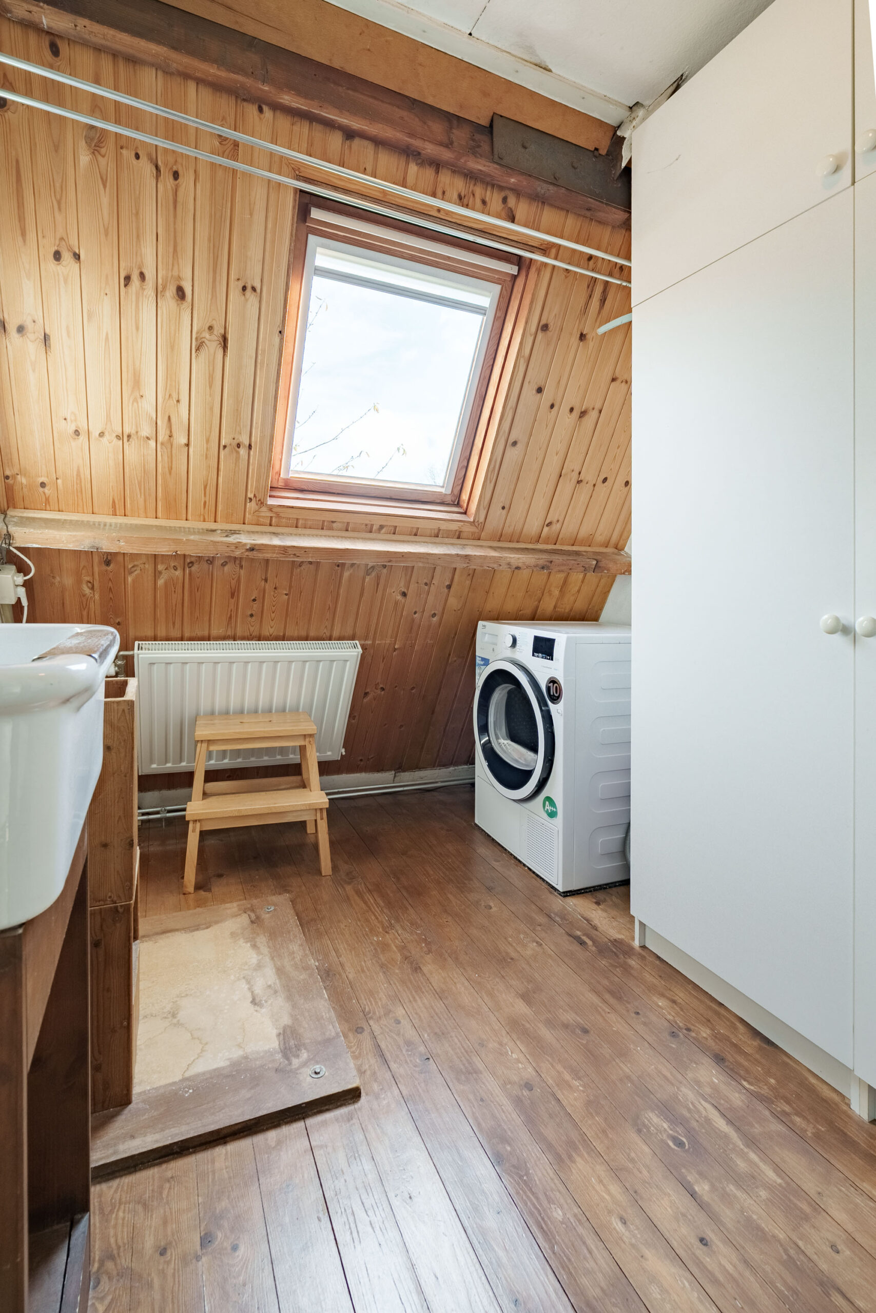 Eerste verdieping: Royale overloop met toegang tot vier ruime slaapkamers, waarvan twee met wastafel en drie met vaste kast. De badkamer beschikt over een inloopdouche, wastafel en een separaat toilet. Ook bevindt zich hier een wasruimte met wastafel en aansluiting voor wasapparatuur. Via een luik met vlizotrap is de bergvliering bereikbaar.
