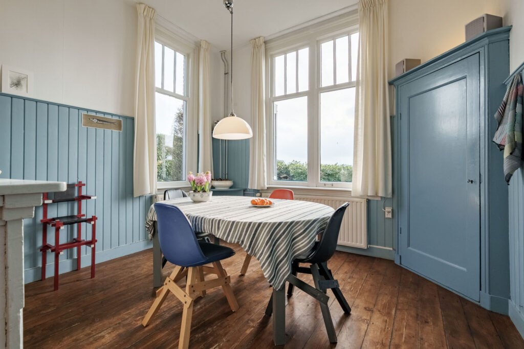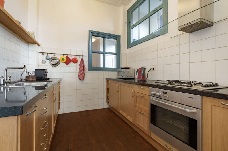 Entree in een ruime hal met separaat toilet en trapopgang naar de eerste verdieping. De hal geeft toegang tot nagenoeg alle ruimten op de begane grond. De sfeervolle kamer-en-suite deze beschikt over een houten vloer en veel lichtinval dankzij de vele ramen. De keuken is voorzien van diverse inbouwapparatuur, waaronder een 4-pits gaskookplaat, oven, vaatwasser, koel-/vriescombinatie en RVS afzuigkap en aansluitend de eetkamer. De kamer op de begane grond (de oorspronkelijke deel) is ingericht als slaapkamer met aangrenzende badkamer, voorzien van een inloopdouche, wastafel, toilet en aansluiting voor wasapparatuur.