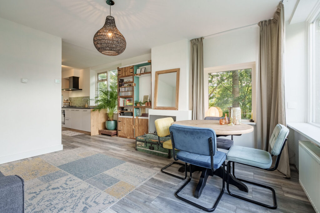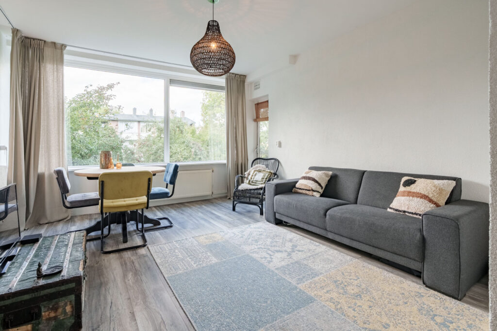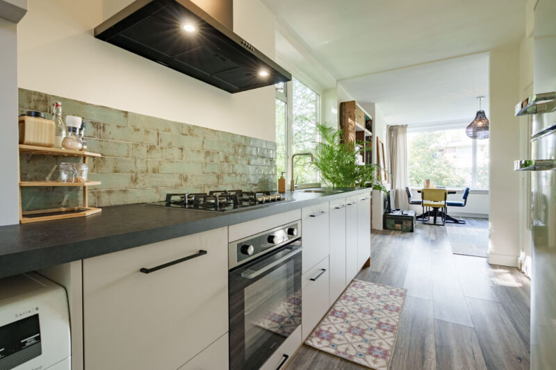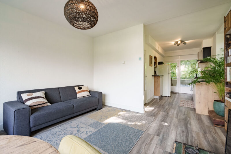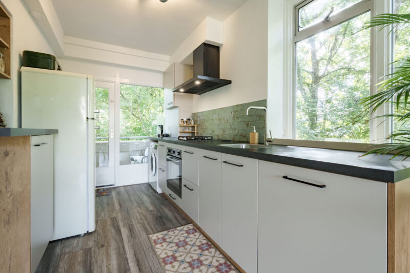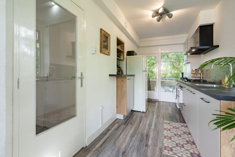 De woonkamer staat in verbinding met de open keuken, die is voorzien van diverse inbouwapparatuur, waaronder een oven, 4-pits gaskookplaat, afzuigkap en een vaatwasser. De keuken is vernieuwd in 2023. Vanuit de keuken bereikt u het balkon aan de achterzijde. Ook zijn in de keuken de aansluitingen voor wasapparatuur aanwezig. De badkamer, bereikbaar vanuit een van de slaapkamers, is uitgerust met een inloopdouche.