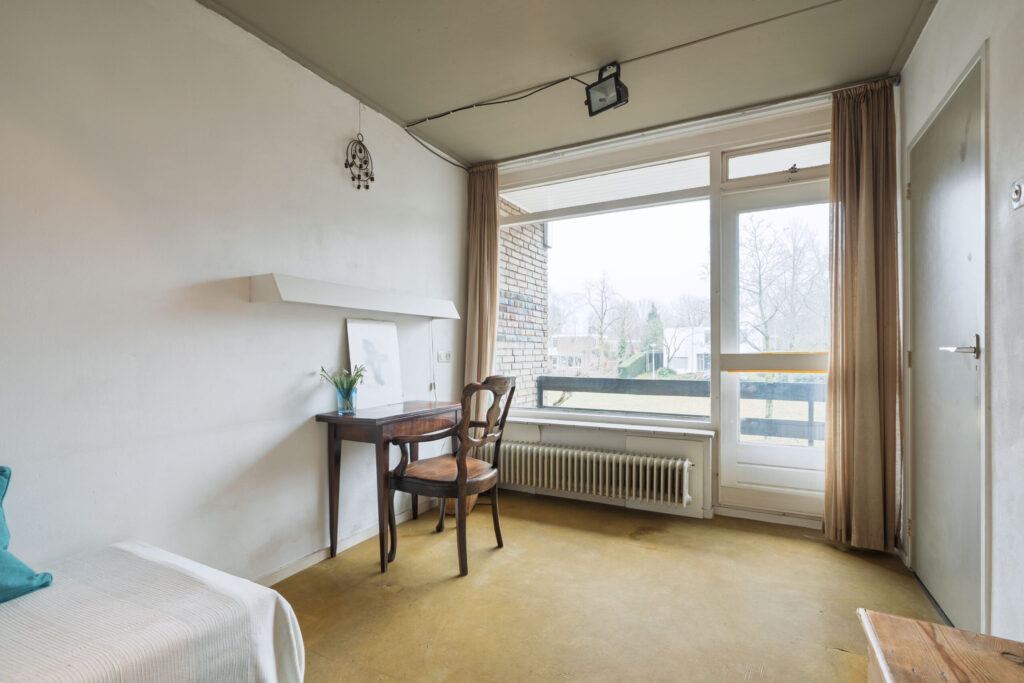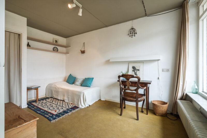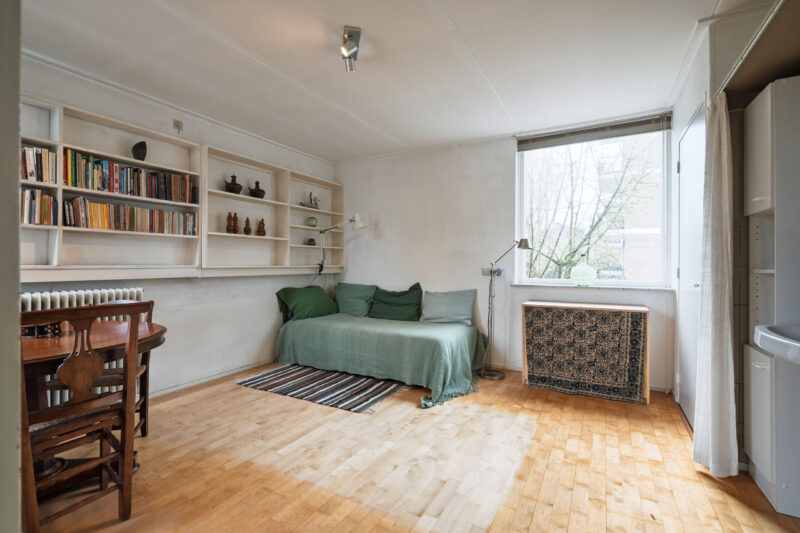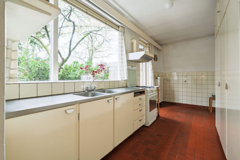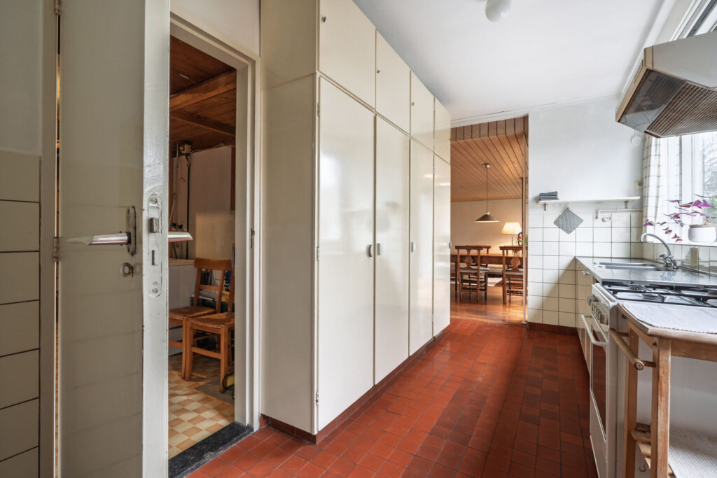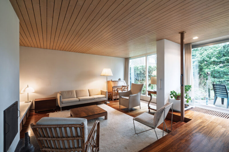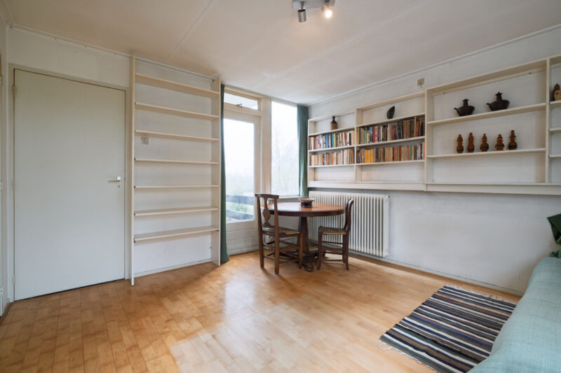 De leefruimte is speels ingedeeld en biedt opvallend veel ruimte. De doorlopende eikenhouten vloer zorgt voor een warm en samenhangend geheel. De zitkuil geeft de ruimte een bijzonder en ruimtelijk effect, terwijl de haard bijdraagt aan extra sfeer en comfort. Dankzij de grote raampartijen aan zowel de voor- als achterzijde is de woning heerlijk licht. De indeling biedt daarnaast volop ruimte voor het creëren van een gezellig eetgedeelte.