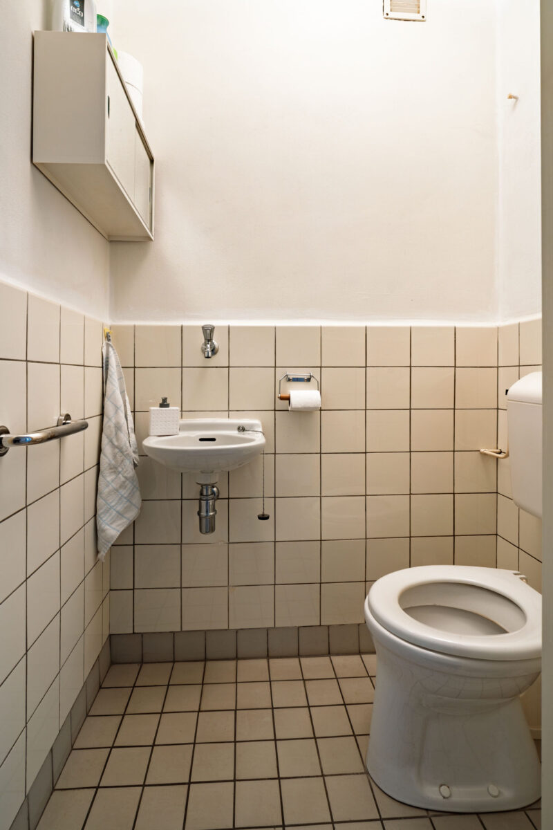 U stapt de woning binnen in de hal, waar zich een separaat toilet met fonteintje, de meterkast en de trapopgang naar de verdieping bevinden.