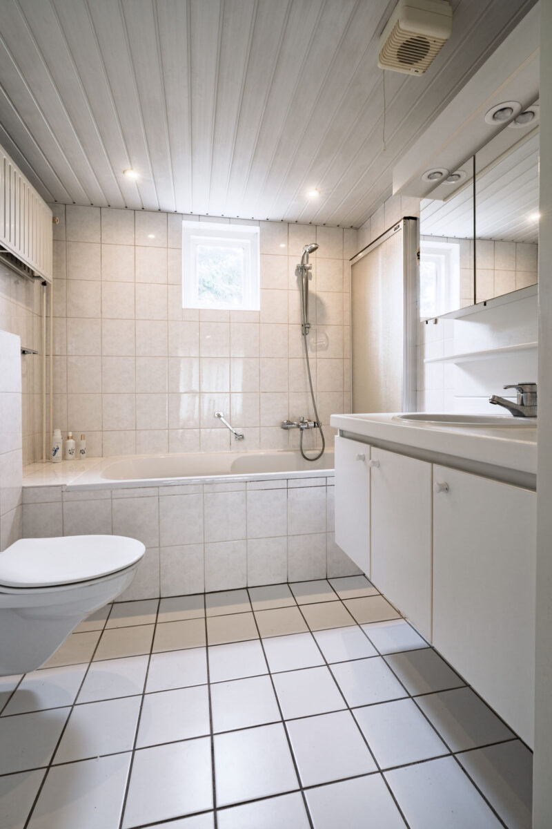 De betegelde badkamer is ingericht met een ligbad, een toilet en een wastafel met wastafelmeubel.