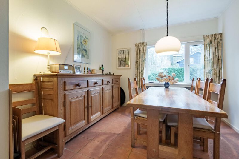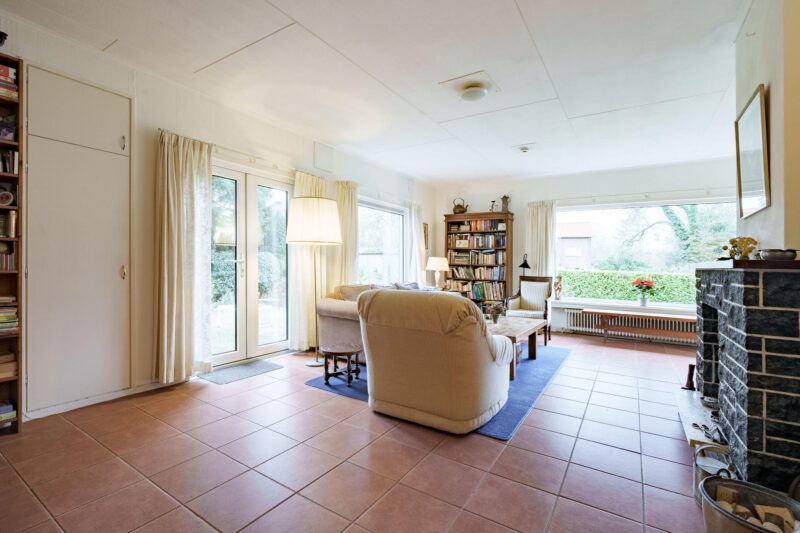 Begane grond: entree, hal, royale en lichte woonkamer met openslaande tuindeuren naar het zonneterras, een open haard en een bergkast. De woonkamer heeft diverse raampartijen waardoor er veel daglicht aanwezig maar biedt ook prachtig uitzicht op de tuin. De woonkamer is tevens voorzien van twee elektrische zonneschermen (1 x uitvalscherm en 1 x knikarm-scherm). Via de hal is de eetkamer bereikbaar, de keuken met inbouwapparatuur, te weten een keramische kookplaat, oven, vaatwasser, koel/vriescombinatie en een close-in-boiler, bijkeuken met een aansluiting voor was apparatuur, een werkkast en toegang tot de tuin, toilet met fontein, royale slaapkamer met badkamer-en suite. De slaapkamer heeft een tweetal praktische inbouwkasten en toegang tot de badkamer. De badkamer is voorzien van een inloopdouche en een wastafelmeubel. Een ruime werkkamer met een inbouwkast en twee elektrische zonneschermen (uitvalschermen).