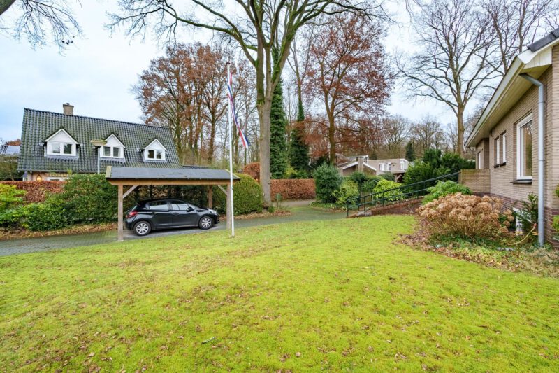 Op de oprit aan de voorzijde van het woonhuis is een houten carport aanwezig.