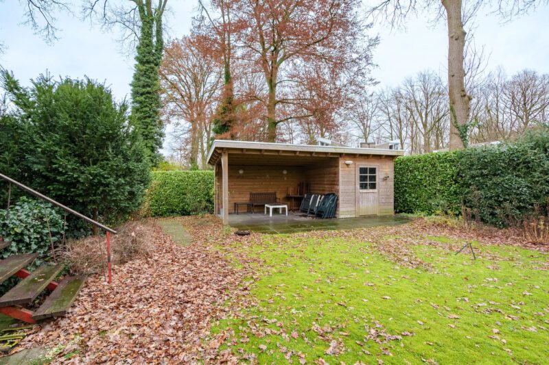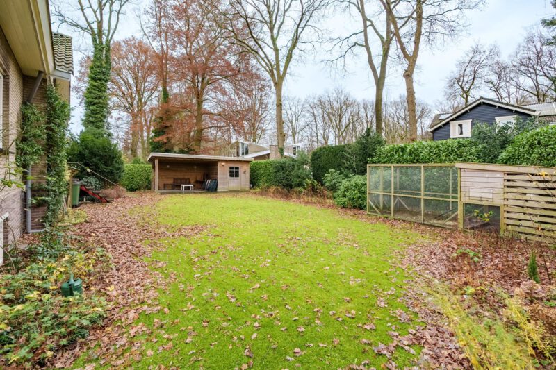 – Een royaal perceel met een mooi grasgazon, een houten berging met veranda en een kippenhok;