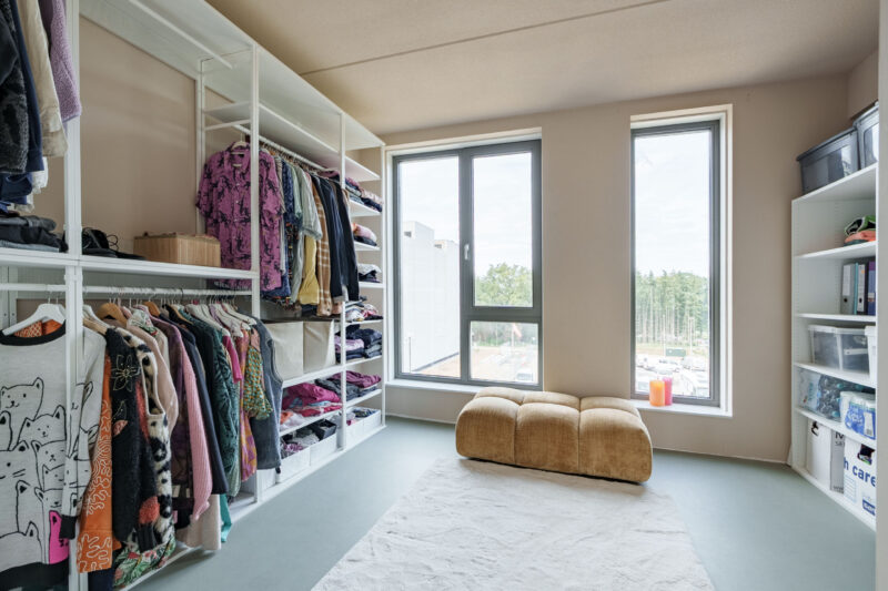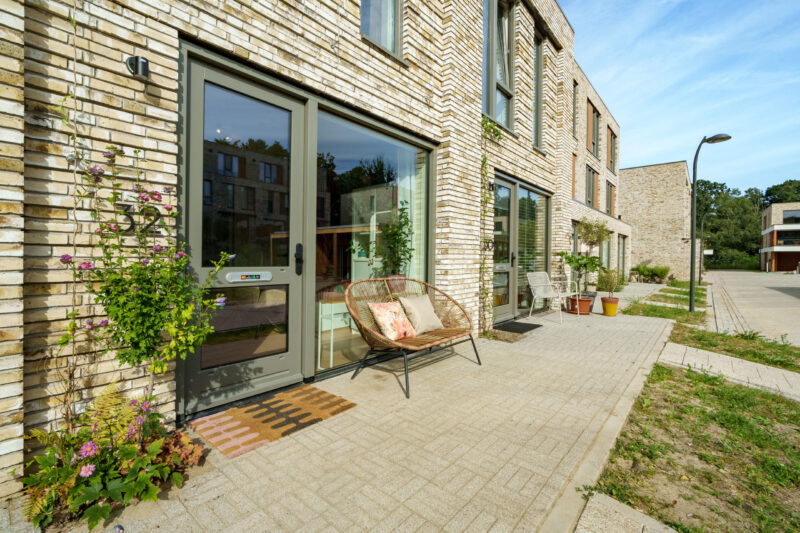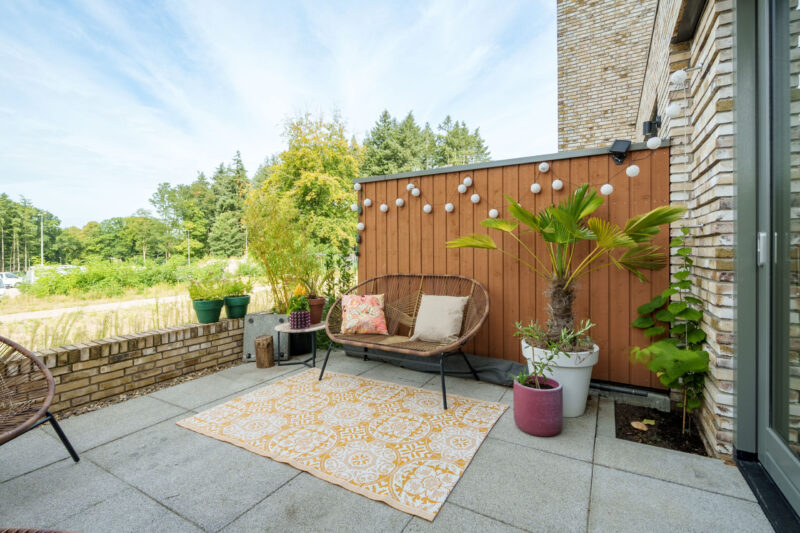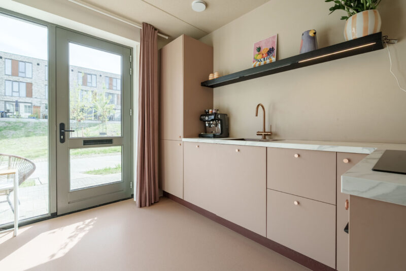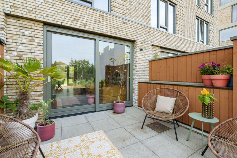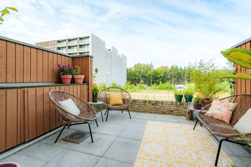 De achtertuin met terras is onderhoudsvriendelijk en voorzien van een buitenkeuken, om zo in de zonnige maanden binnen en buiten echt met elkaar te verbinden. Daarnaast is er toegang tot de gezamenlijke binnentuin met moestuin en speelplekken. Een fijne plek om elkaar te ontmoeten. Bij de woning hoort een privé parkeerplaats en een berging in het naastgelegen gebouw. Ook is er een gezamenlijke overdekte fietsenstalling.