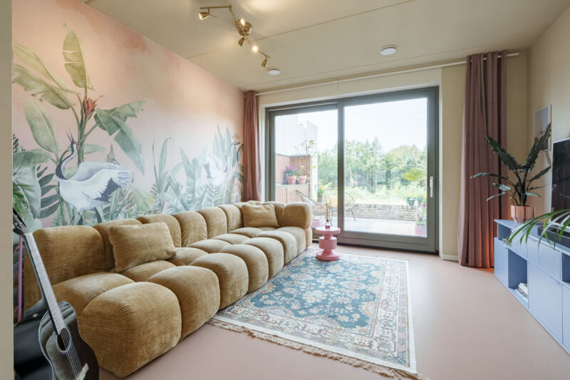 De woonkamer ligt aan de achterzijde (zuidwesten) en heeft een royale schuifpui naar de tuin. Dit zorgt voor veel licht en een prachtig zicht op het terras en het toekomstige voedselbos dat volgend jaar aangelegd gaat worden.