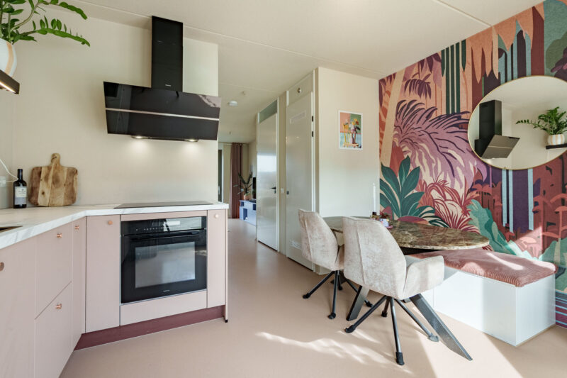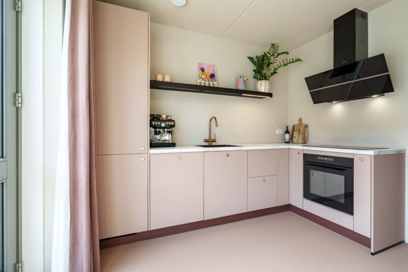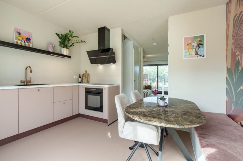 Bij binnenkomst stap je direct de lichte en zonnige leefkeuken in. De hoekopstelling heeft een frisse uitstraling en is voorzien van moderne inbouwapparatuur, waaronder inductiekookplaat, combi-oven, vaatwasser, koel-vriescombinatie en een Quooker. De keuken biedt ruimte voor een gezellige eethoek en staat in open verbinding met de woonkamer. De lichte vloer met vloerverwarming loopt door in de woonkamer en zorgt voor een ruimtelijk gevoel.