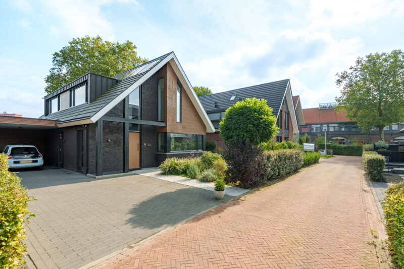 met een aangebouwde volledig geïsoleerde en verwarmde stenen berging (ca. 20 m²) met een carport en meerdere parkeerplaatsen op eigen terrein.