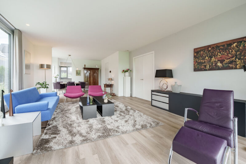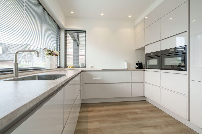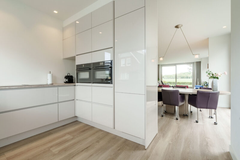 Een heerlijke lichte royale living met grote schuifpuien die een panoramische view geven op de landelijke omgeving. Semi-open keuken voorzien van een zacht grijze, luxe hoogglans designer keuken. De keuken heeft een U-vormige keukenopstelling met NEFF inbouwapparatuur: inductiekookplaat met een geïntegreerde afzuiging, combi-oven/magnetron, stoomoven/oven, een grote koelkast, vaatwasser en een Quooker.