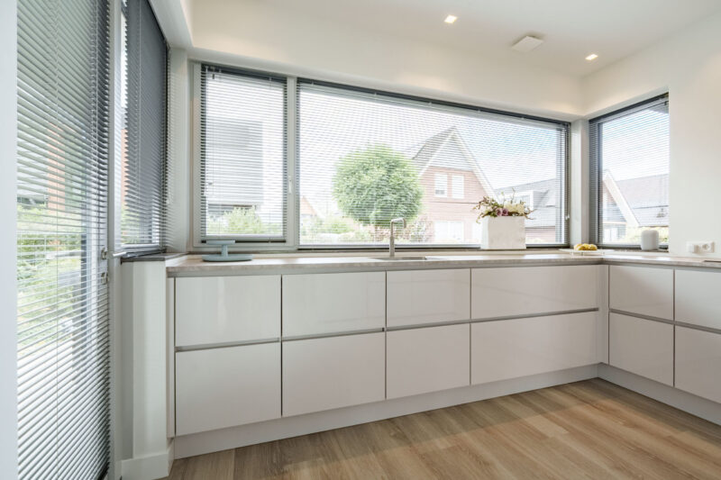 – Stijlvolle stompe deuren met mooie RVS deurbeslag;