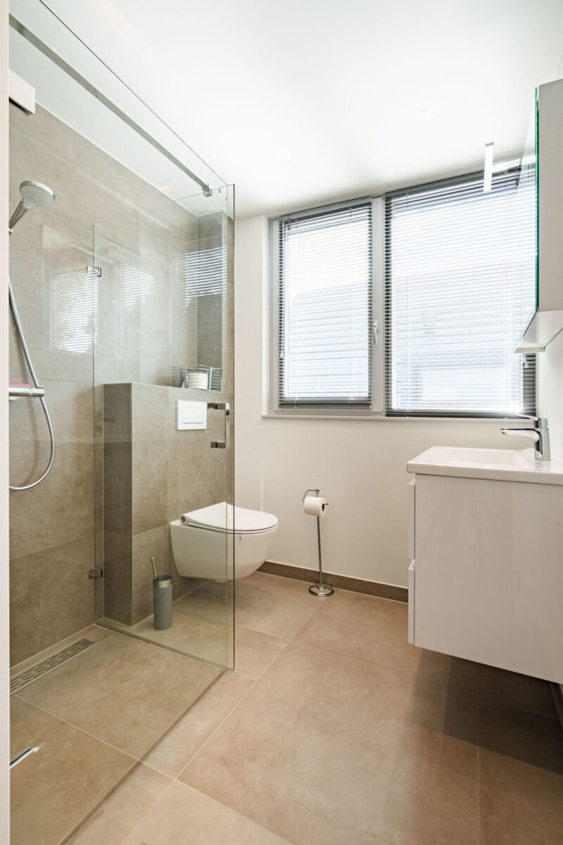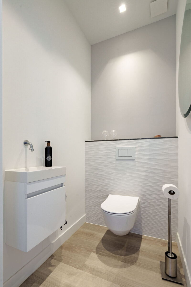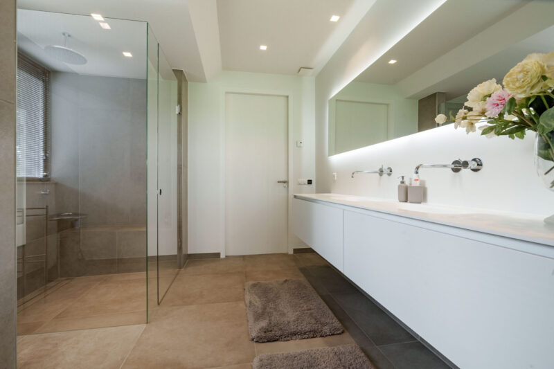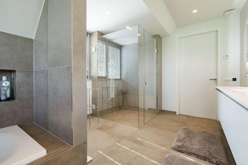 Vanuit de overloop is de 2e badkamer te bereiken die voorzien is van een toilet, inloopdouche en een wastafelmeubel. Achter de op maat gemaakte schuifwandkast is de bergkast aanwezig en waar zich ook de wasmachine aansluiting bevindt.