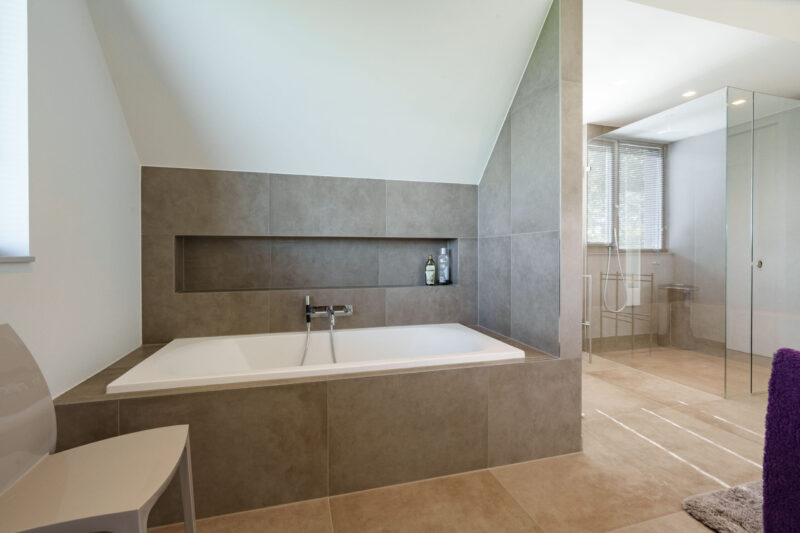 Overloop waar zowel de trap als de lift uitkomen. Een mooie royale Masterbedroom met ruimte voor een walk-in-closet en met een en-suite badkamer. De dakkapel zorgt voor een grote hoeveelheid licht en ruimte. De wellness  badkamer met inbouwspots heeft een luxe uitstraling en geeft het gevoel van een chique hotel. De inrichting bestaat uit een verdiept ligbad, inloopdouche met een modern glazen douchewand en een infra-rood sunshower die zorgt voor warmte en ontspanning en een 2 persoons wastafelmeubel met dubbele kranen.