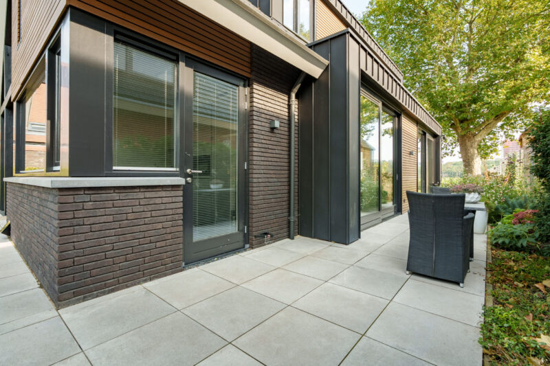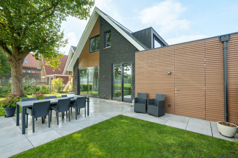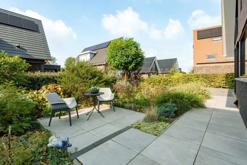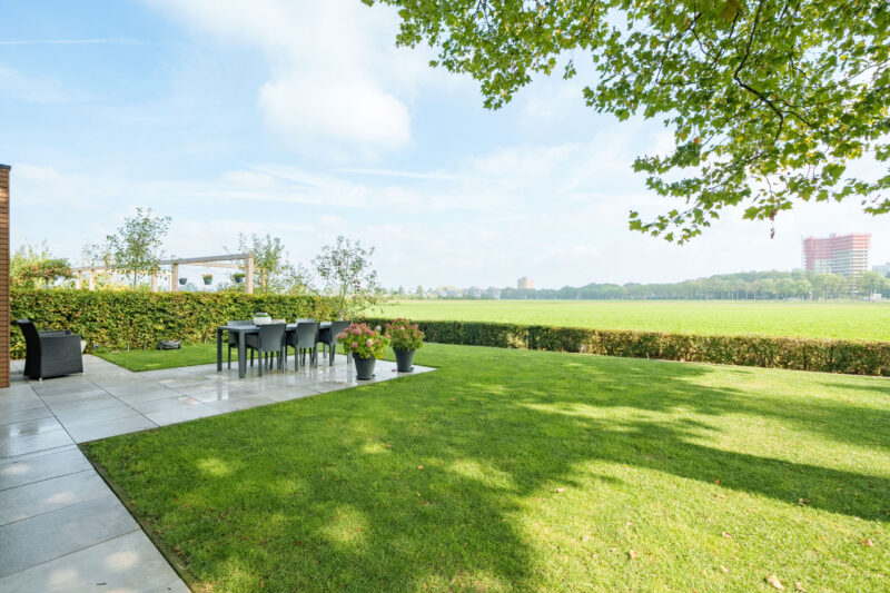 De woning heeft een prachtig aangelegde moderne en onderhoudsvriendelijke tuin welke in harmonie is met de omgeving. De strakke structuren zijn perfect in balans. Zo is de berging voorzien van houten wandpanelen met natuurlijke uitstraling en geïntegreerde deuren. Dit geeft een rustige minimalistische uitstraling.