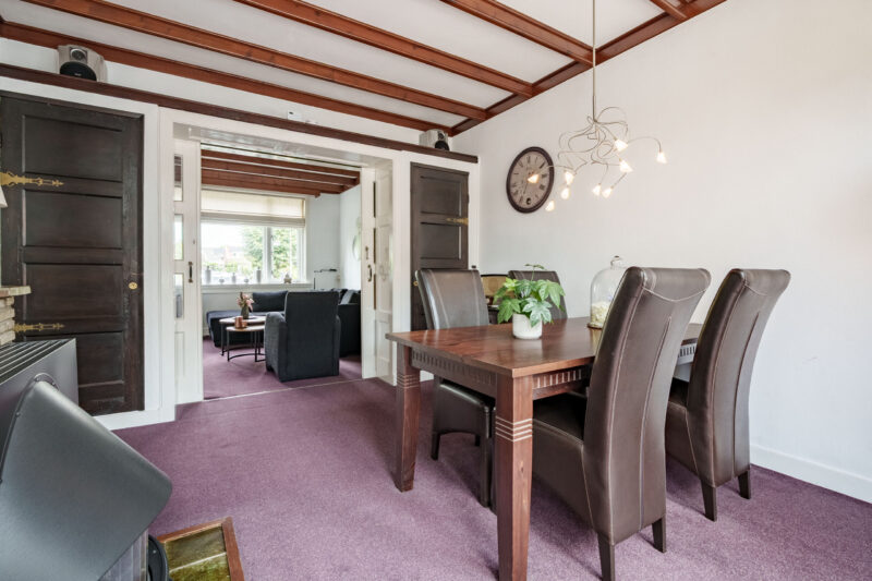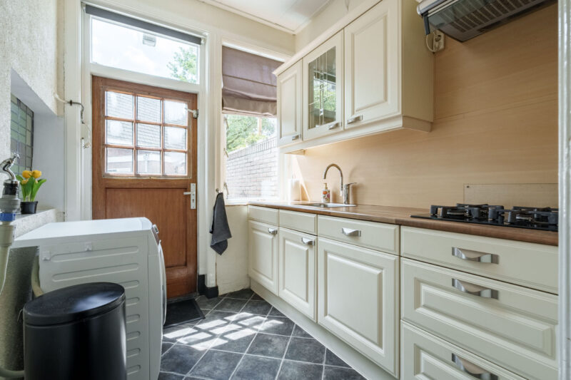 Begane grond: entree, voorportaal met garderobenis, hal, toilet, provisiekelder, kamer-en-suite met de elegante ensuite schuifdeuren en inbouwkasten met paneeldeuren die de ruimten een klassieke uitstraling geven. De zithoek bevindt zich aan de voorzijde en de eetkamer aan de achterzijde. Via de openslaande tuindeuren kunt u de achtertuin betreden. De voor-en achterkamer zijn beide voorzien van een gaskachel. Dichte keuken met een keukenopstelling, aansluiting voor wasapparatuur en een achterdeur. De keuken is voorzien van een 4-pits gaskookplaat, vaatwasser, koelkast en een afzuigkap.