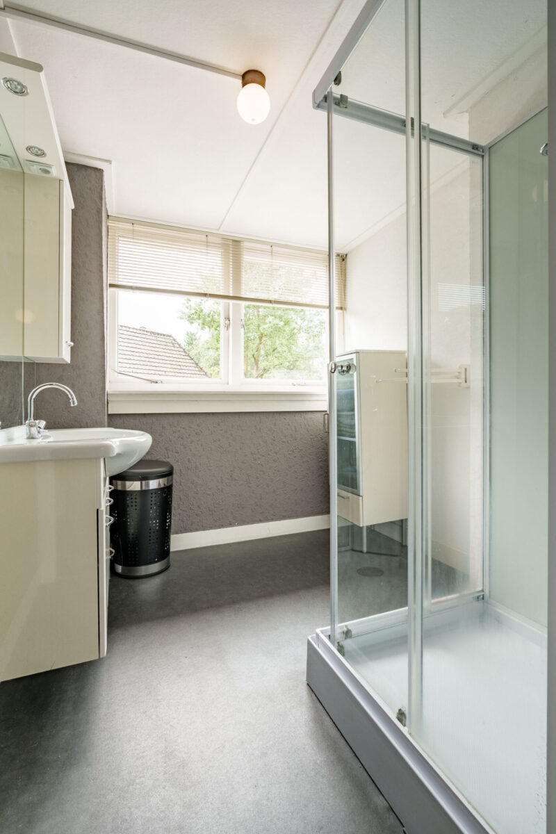 1e verdieping: overloop, riante slaapkamer aan de voorzijde met een wastafel en een vaste inbouwkast, slaapkamer 2 ligt eveneens aan de voorzijde, riante slaapkamer 3 aan de achterzijde met een vaste inbouwkast, badkamer met een douchehoek en een wastafelmeubel, separaat tweede toilet.