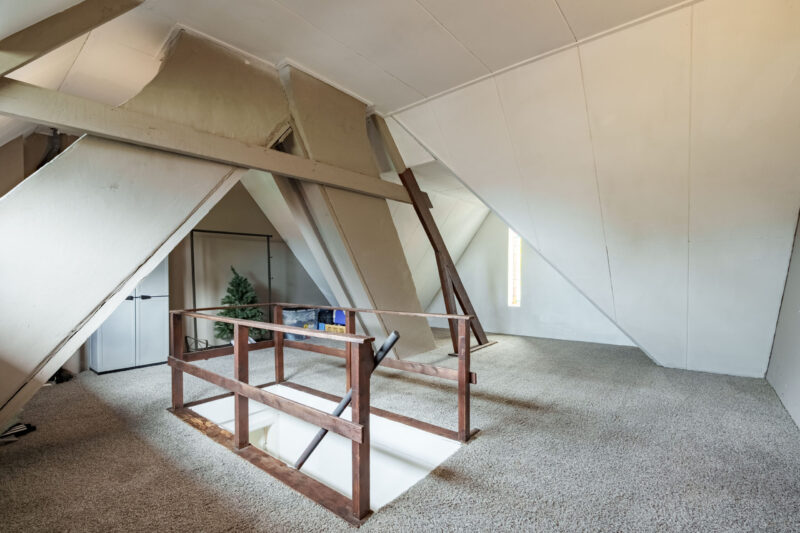 via vaste trap te bereiken open zolderkamer met 2 dakramen die zorgen voor veel lichtinval en een glas-in-lood-raam.