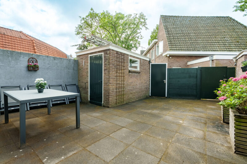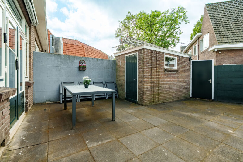 Een vrijstaande stenen berging is aanwezig in de achtertuin.