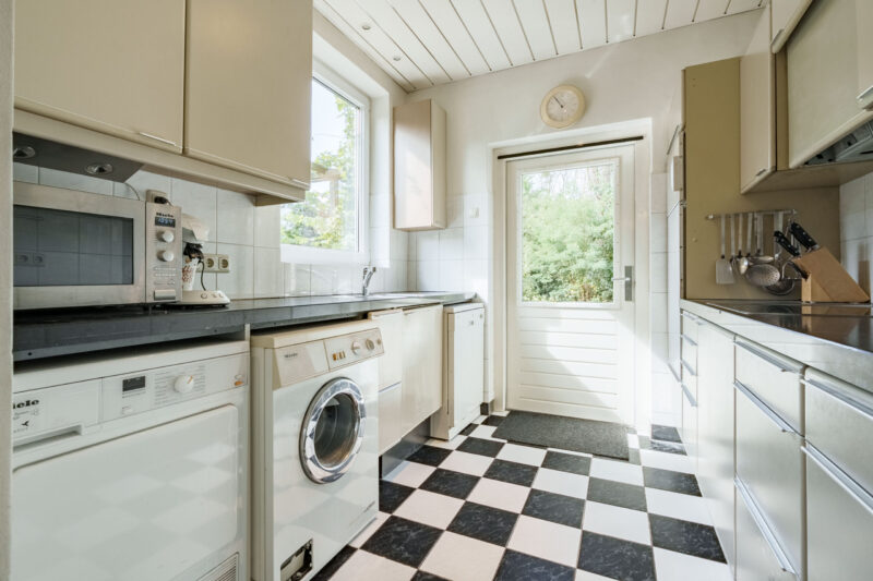 De hal heeft een kelder op stahoogte (ca. 9 m²). Toilet met fontein en een dichte keuken voorzien van een achterdeur.