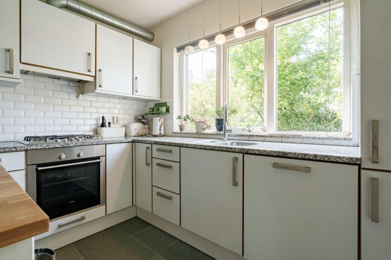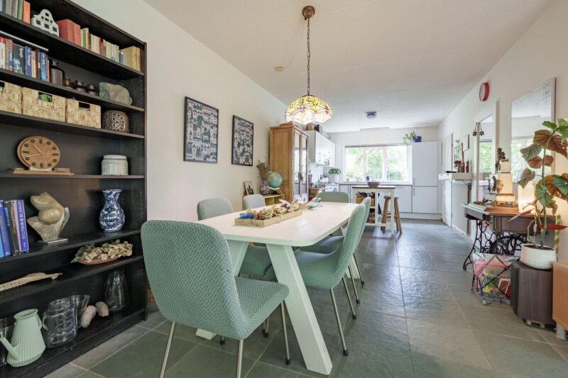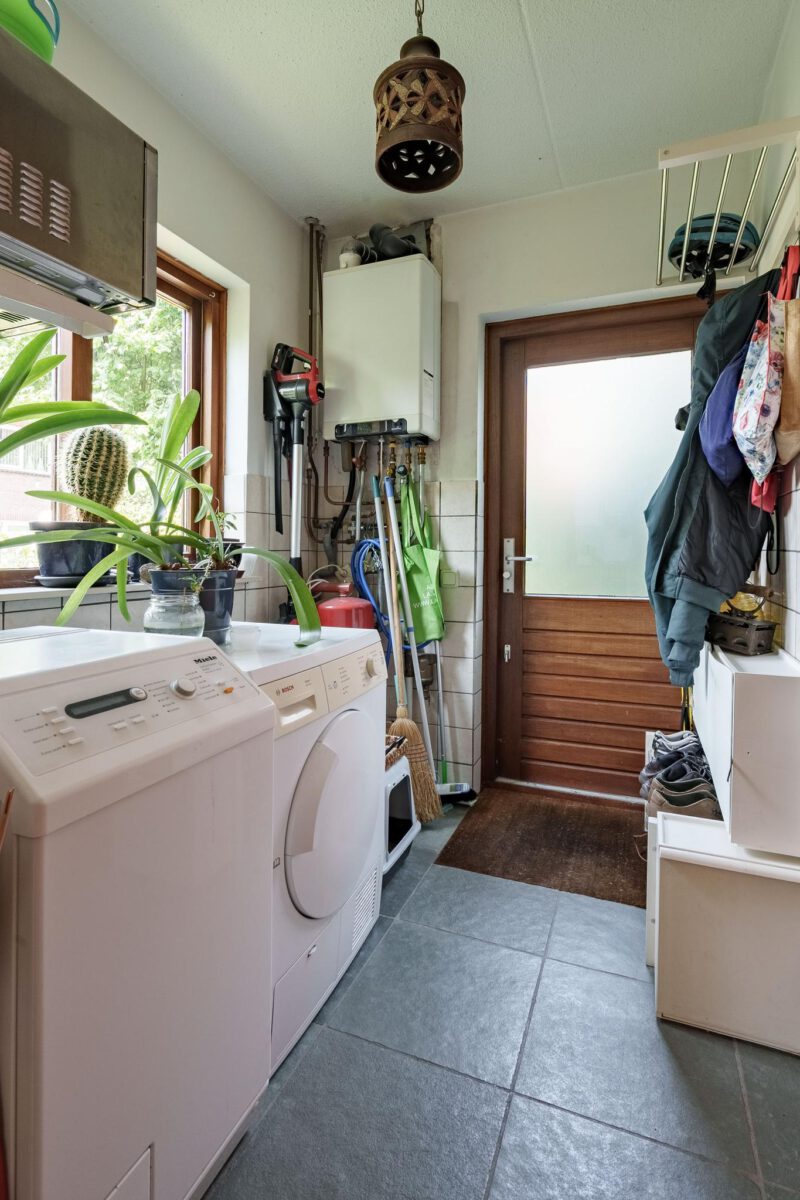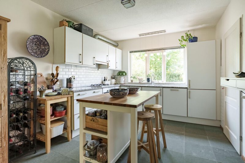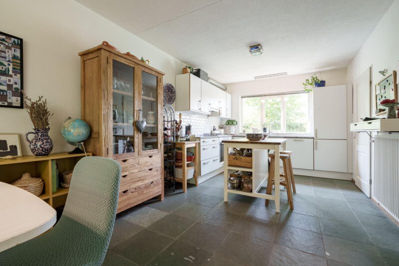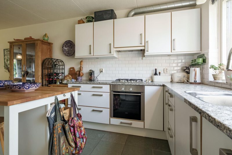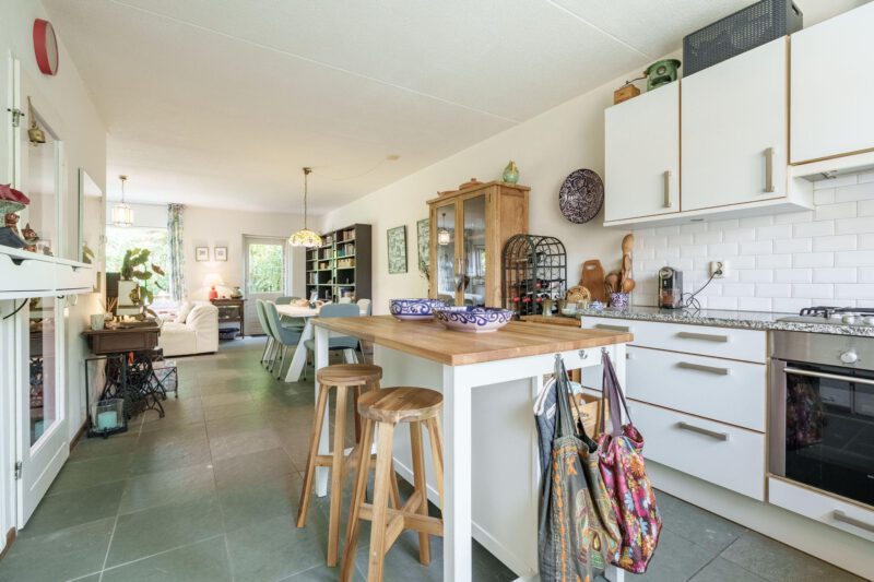 De open keuken is gelegen aan de voorzijde van de woning en is uitgerust met diverse inbouwapparatuur, waaronder een gaskookplaat, afzuigkap, koelkast, vriezer en vaatwasser. Het praktische keukeneiland biedt extra werkruimte. Aansluitend aan de keuken bevindt zich een handige bijkeuken, voorzien van aansluitingen voor wasapparatuur en extra opbergmogelijkheden. Via de bijkeuken is er directe toegang tot de achtertuin.