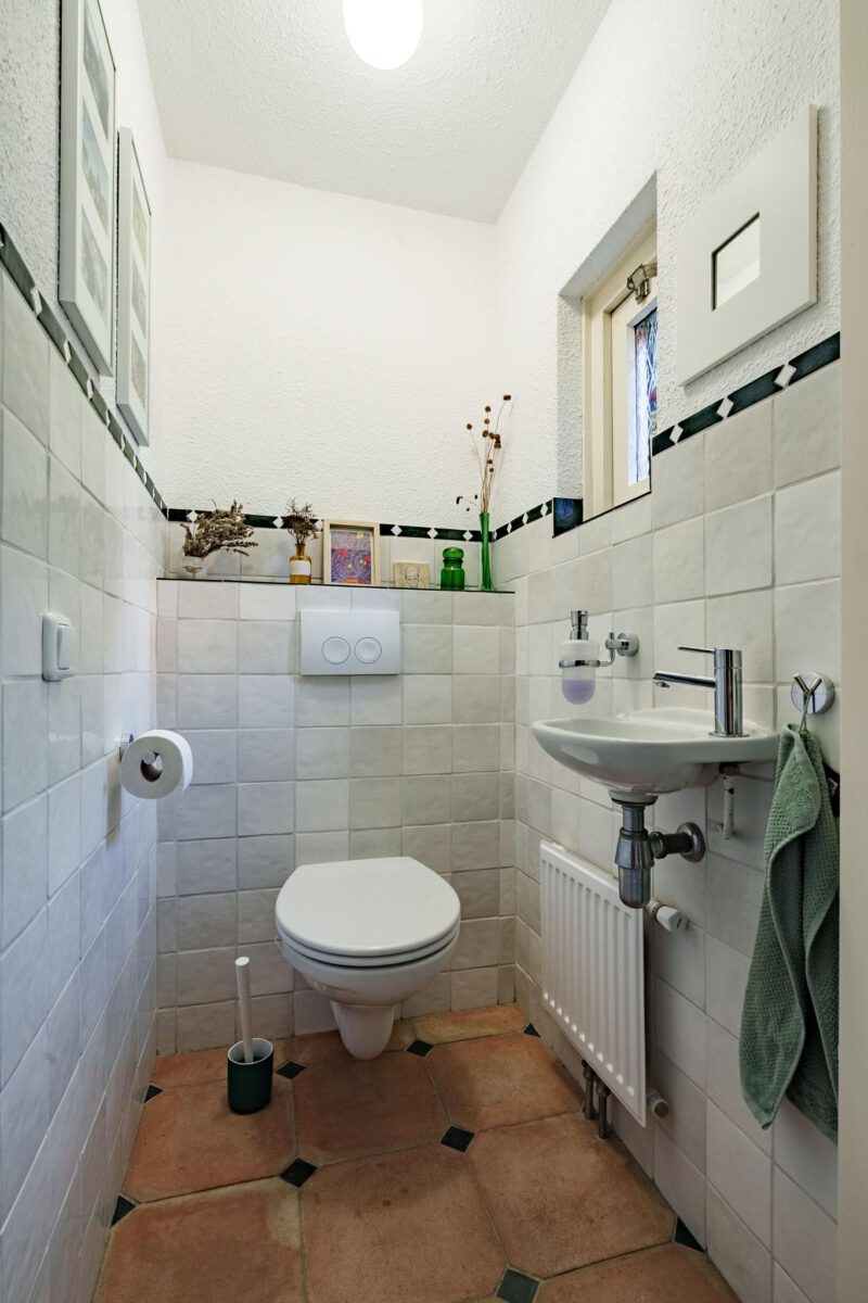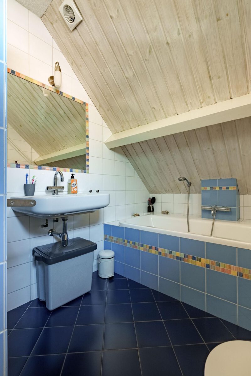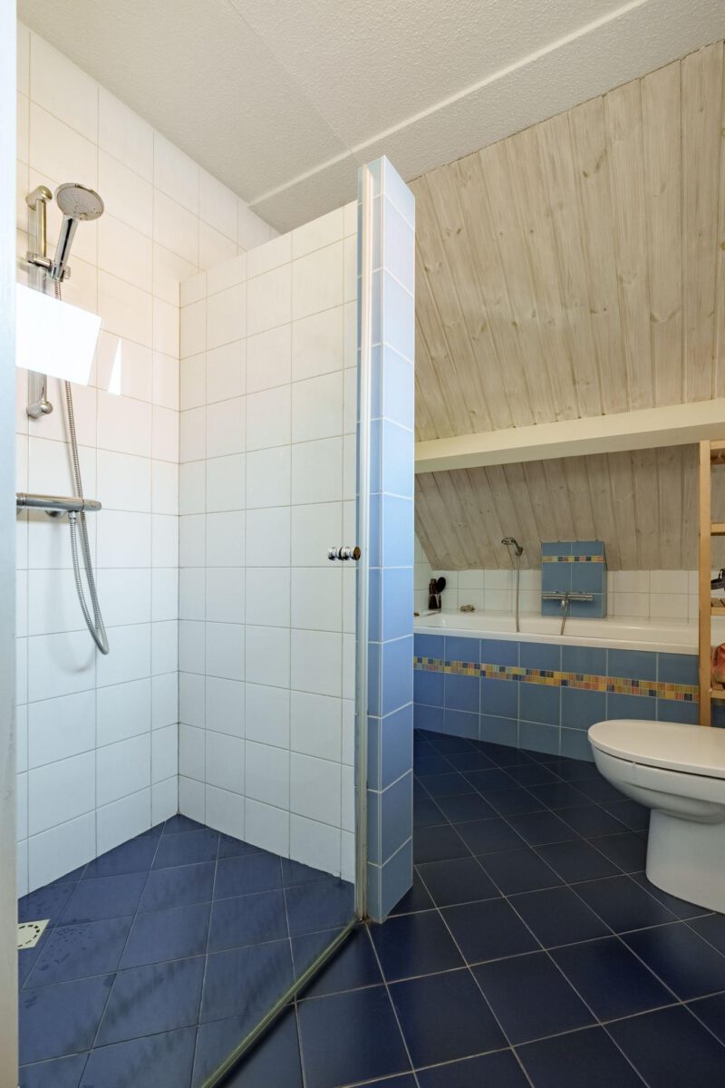 De badkamer is uitgevoerd in een frisse blauwe tegel en beschikt over een ligbad, douchecabine met glazen wand, tweede toilet en een wastafel met fonteintje.