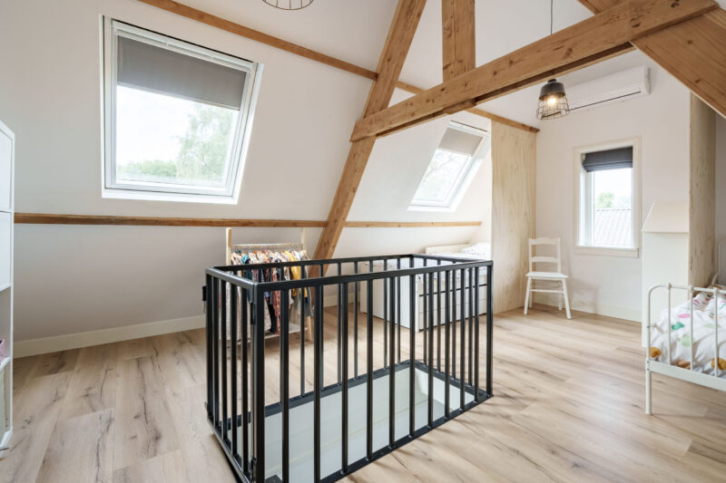 Tweede verdieping: Zolderruimte met een derde slaap/- werkkamer voorzien van een laminaatvloer, airco en twee dakramen.