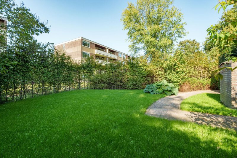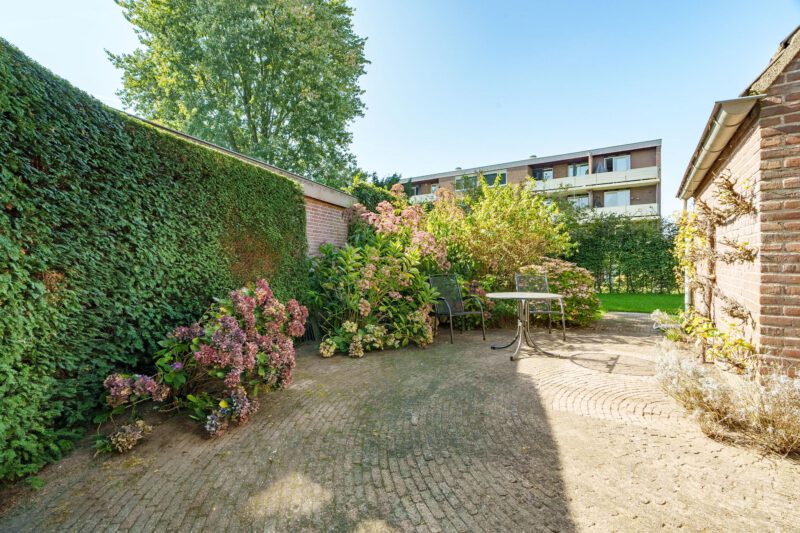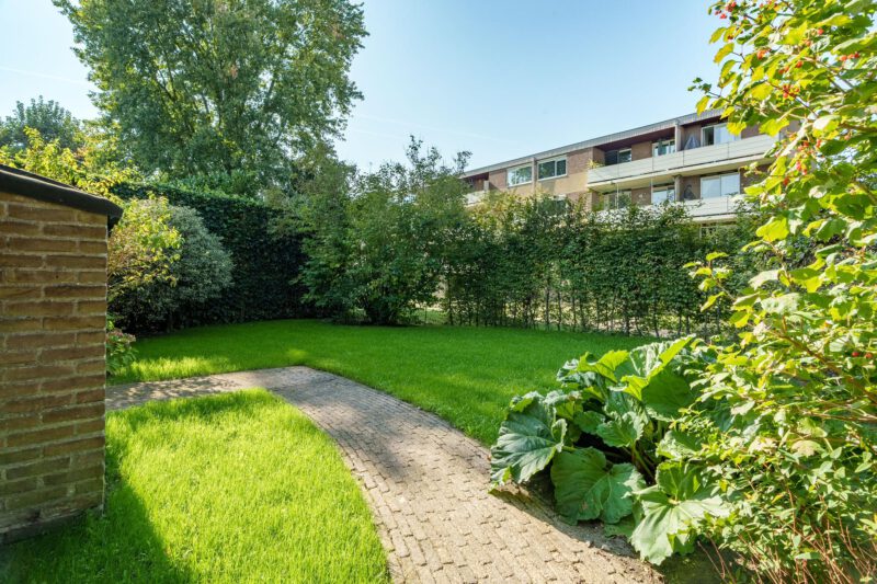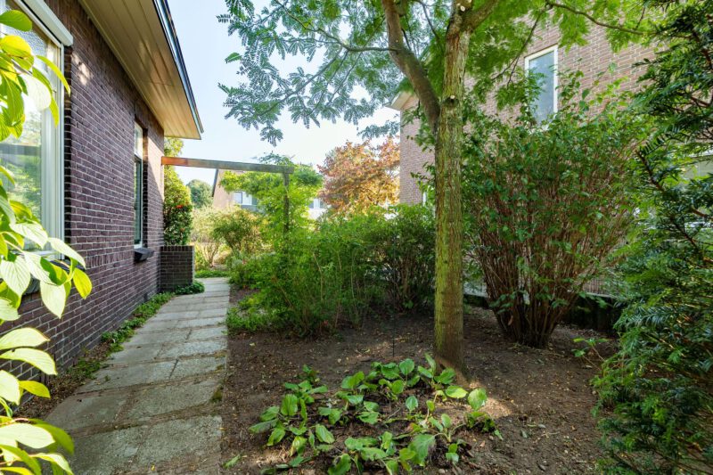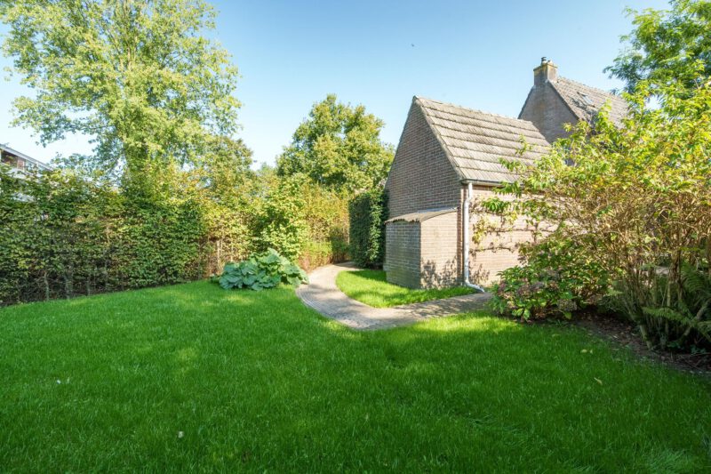 De fraai aangelegde tuin beschikt over een veelzijdigheid van struiken en planten, een ruim terras en groot en goed onderhouden gazon.