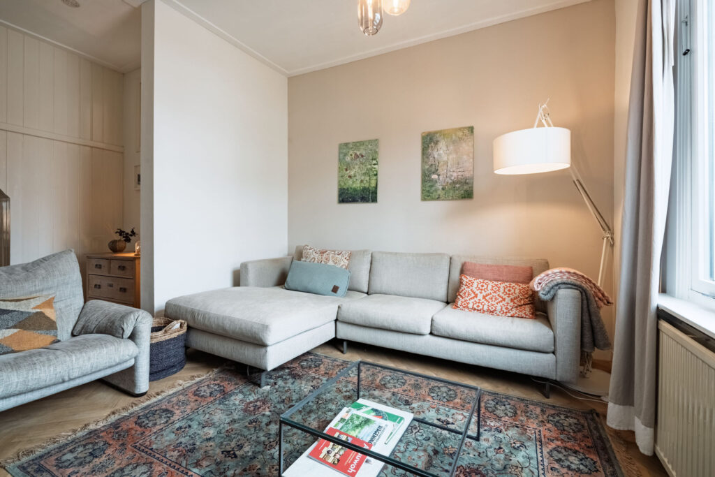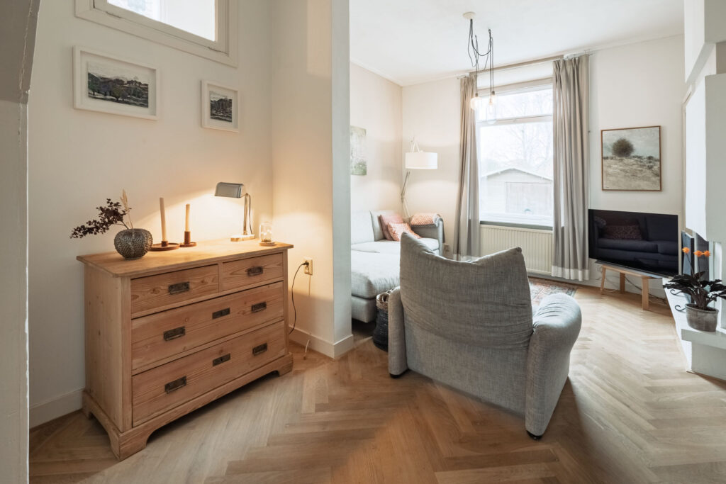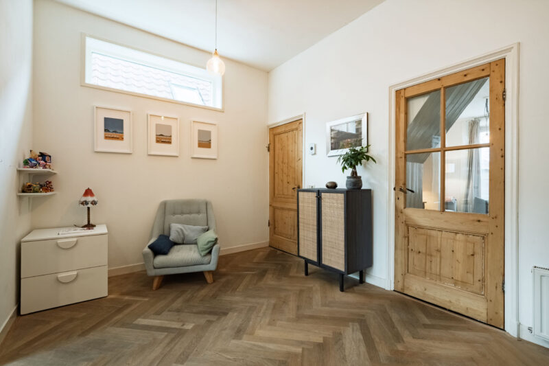 Vanuit de woonkamer is via een tussenkamer de gezellige zitkamer aan de voorzijde van het woonhuis bereikbaar. Deze zitkamer is voorzien van een open haard. De hal, de tussenkamer en de zitkamer zijn afgewerkt met een houten vloer, wat zorgt voor een warme en sfeervolle uitstraling.