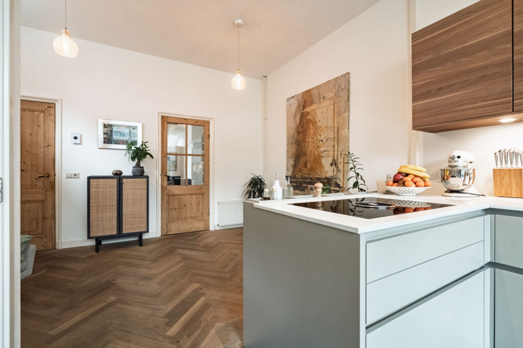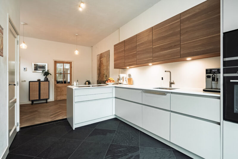 De woonkeuken is ingericht met een moderne L-vormige keukenopstelling en voorzien van diverse inbouwapparatuur, te weten: een magnetron, oven, koel- en vriescombinatie, kookplaat met geïntegreerde afzuiginstallatie en vaatwasser. Aangrenzend bevindt zich een provisiekast met aansluitingen voor wasapparatuur.